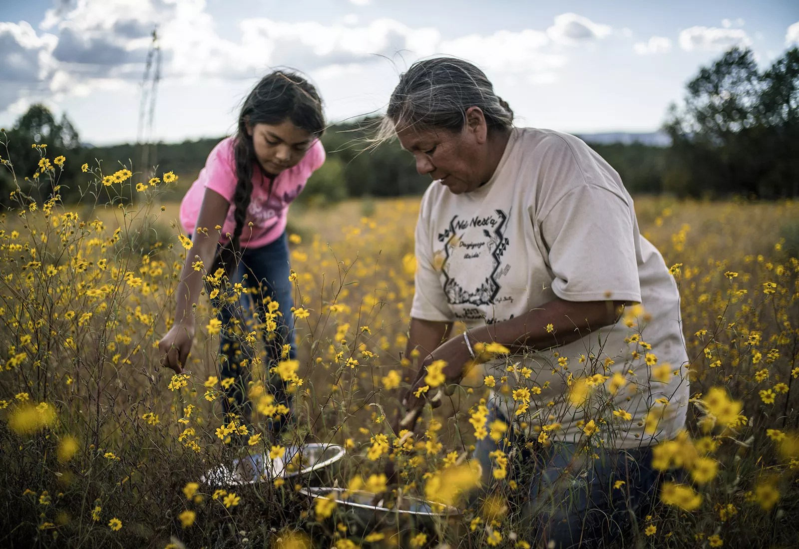 But gaining food sovereignty and reconnecting to traditional food systems has provided those featured in Gather a way to continue to reclaim their own spiritual and cultural identities. Twila Cassadore (San Carlos Apache) forages traditional Apache foods in Arizona and shares that insight with tribal members. Clayton Harvey (White Mountain Apache) grows ancestral food such as Anasazi beans on Ndée Bikíyaa, the People’s Farm. Elsie DuBray (Cheyenne River Sioux Nation) has studied lipid structures in bison meat, which her family raises and harvests, as a way to bridge traditional knowledge with the science community.