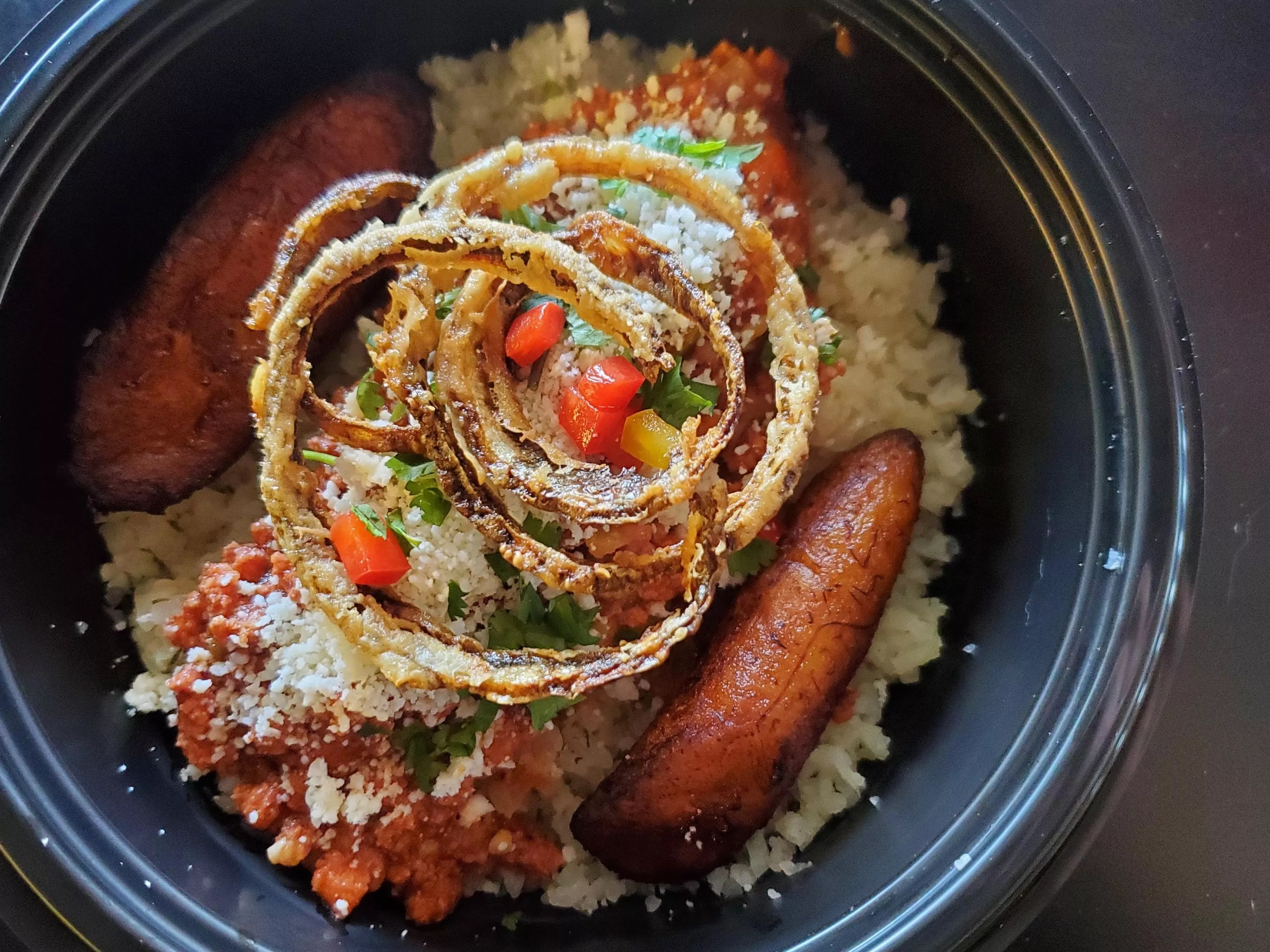 The Capt Jack at Toro comes with cauliflower rice, beef picadillo, sweet plantains, crispy onions and queso fresco.