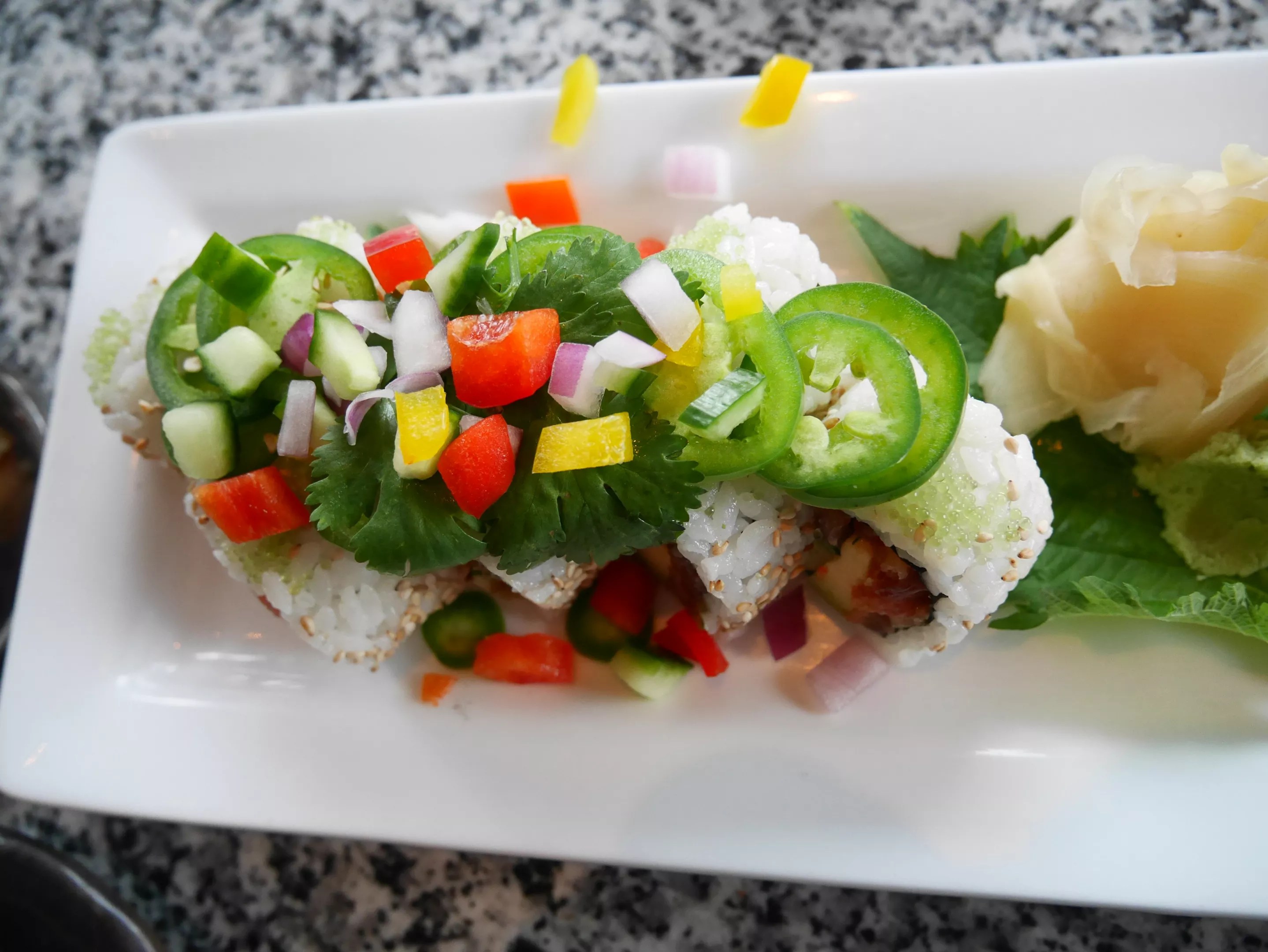 The firecracker roll pops with fresh veggies and spicy jalape