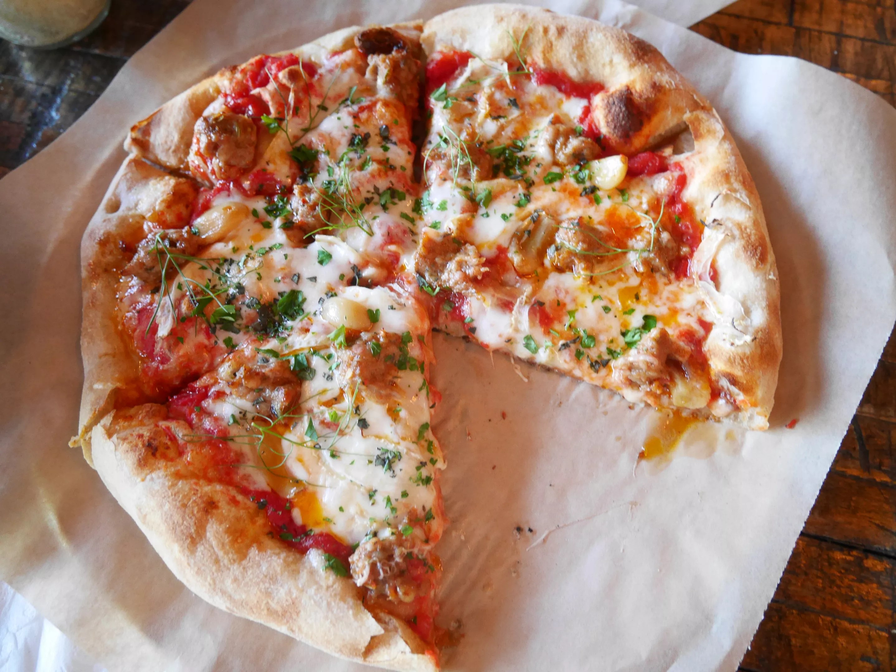 The Johnny is fresh, sweet and light, and has a bit more going on, with sliced fennel on the pizza and fennel seed in the housemade red ale sausage. Roasted garlic and oregano surprise your tastebuds every couple of bites.