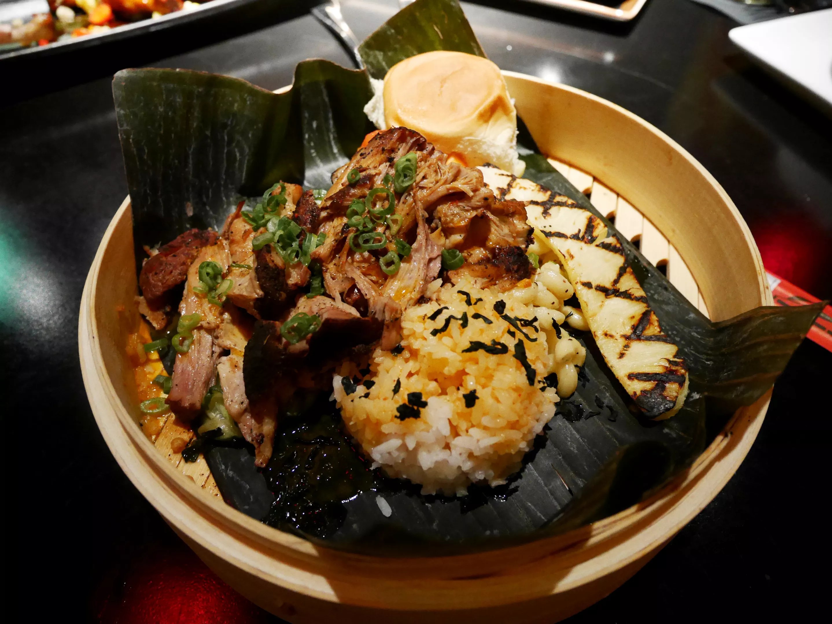 For an entree, the Hawaiian mix plate with Kona kalua pork is both affordable and decadent. This beautiful platter is an elaborate barbecue plate, served in a bamboo steamer with rice, macaroni salad, fruit, and the crowd-favorite King’s Hawaiian roll. The melt-in-your-mouth pork and all the sides are typical of diners in Hawaii that cater more to locals than tourists.