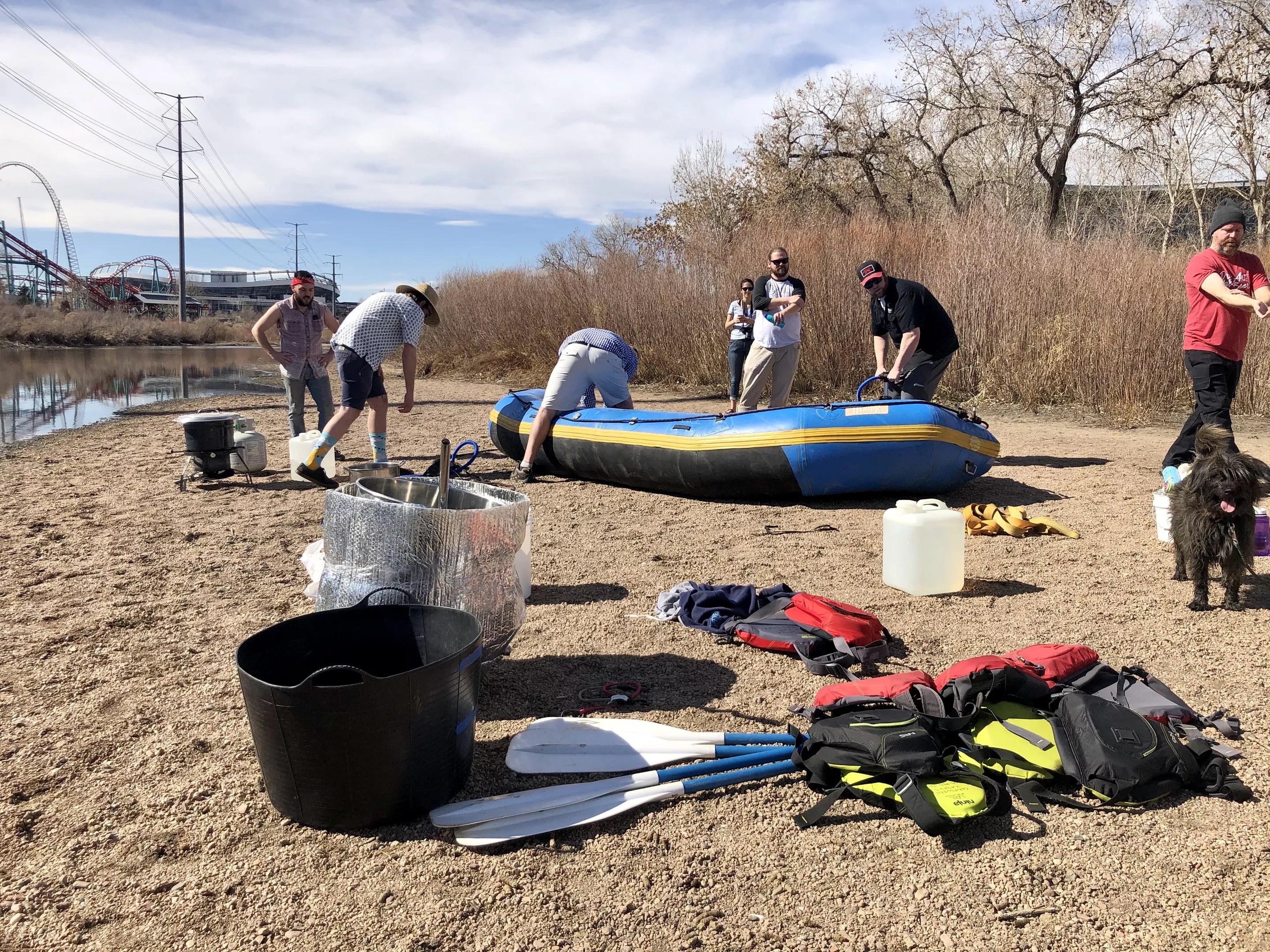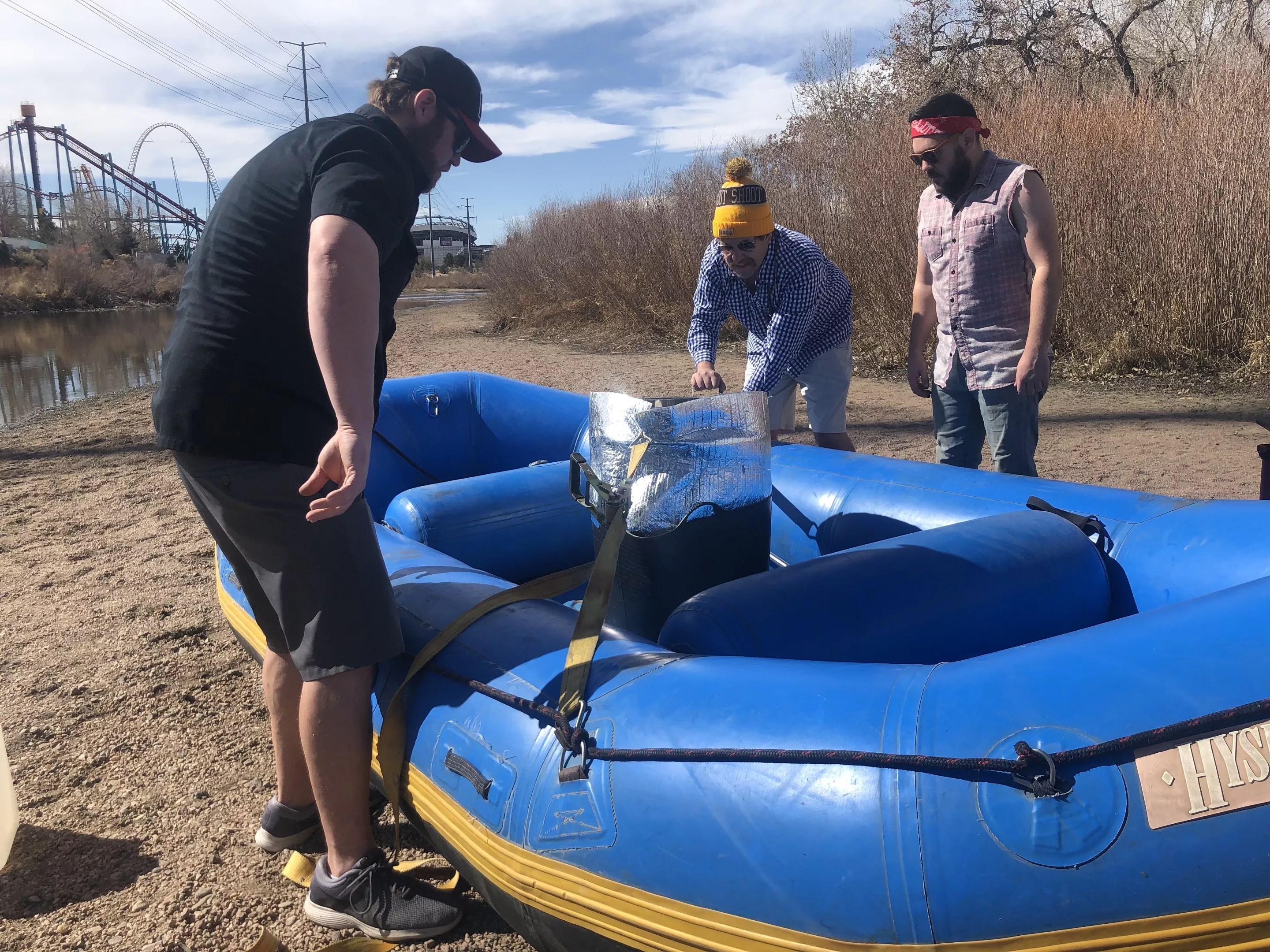 To kick off the unusual project, the intrepid crew carried a raft, paddles and some makeshift brewing equipment to a sandy spot along the Platte between the Denver Aquarium and Confluence Park. There, they boiled water in a giant pot and added barley before tying the pot, inside a double-insulated sleeve, onto the raft. Then, with six crewmen aboard, the raft floated under bridges and through rapids – with beers in hand – to Globeville Landing, where they disembarked.