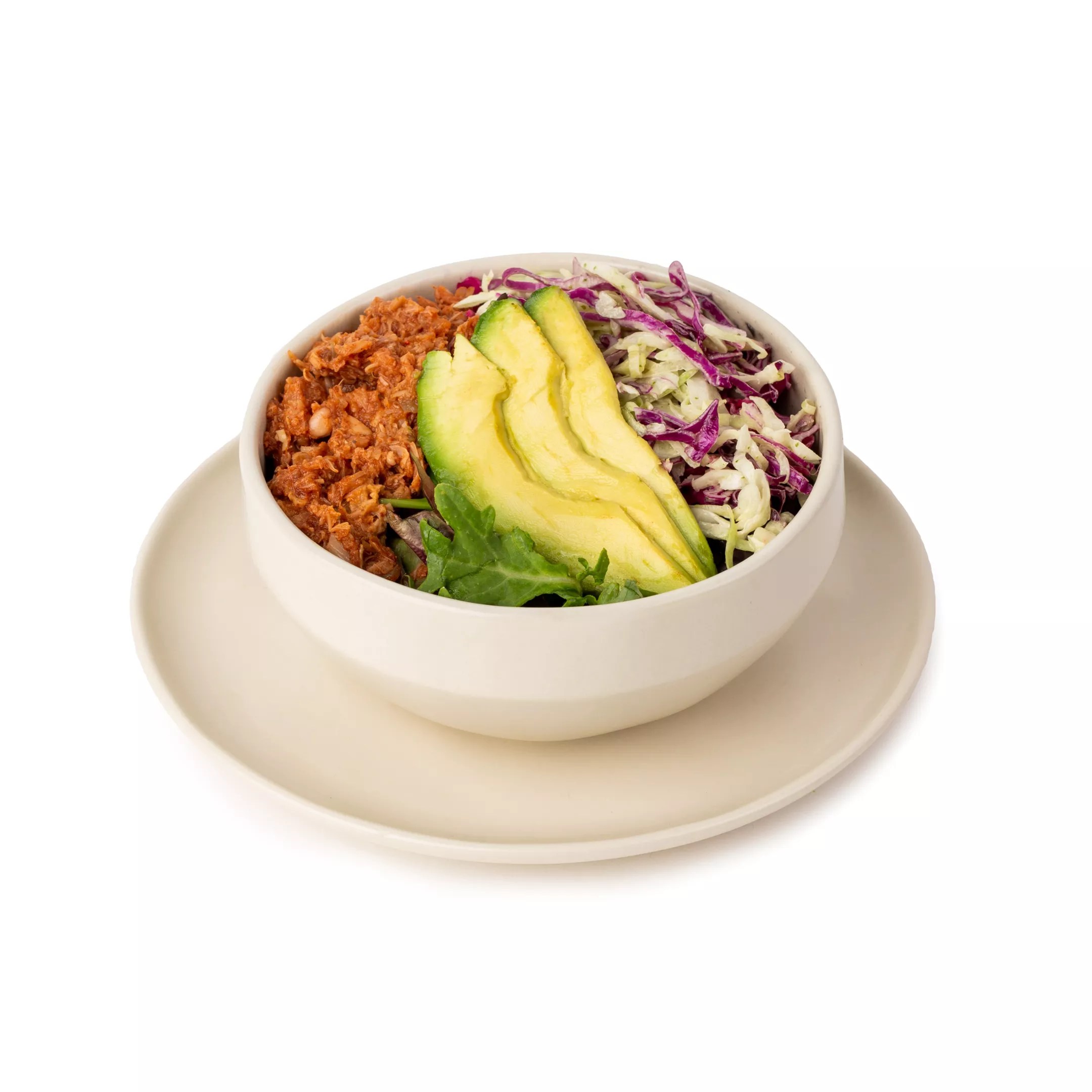 Barbecue jackfruit is topped with fresh avocado with a base of black beans and quinoa.
