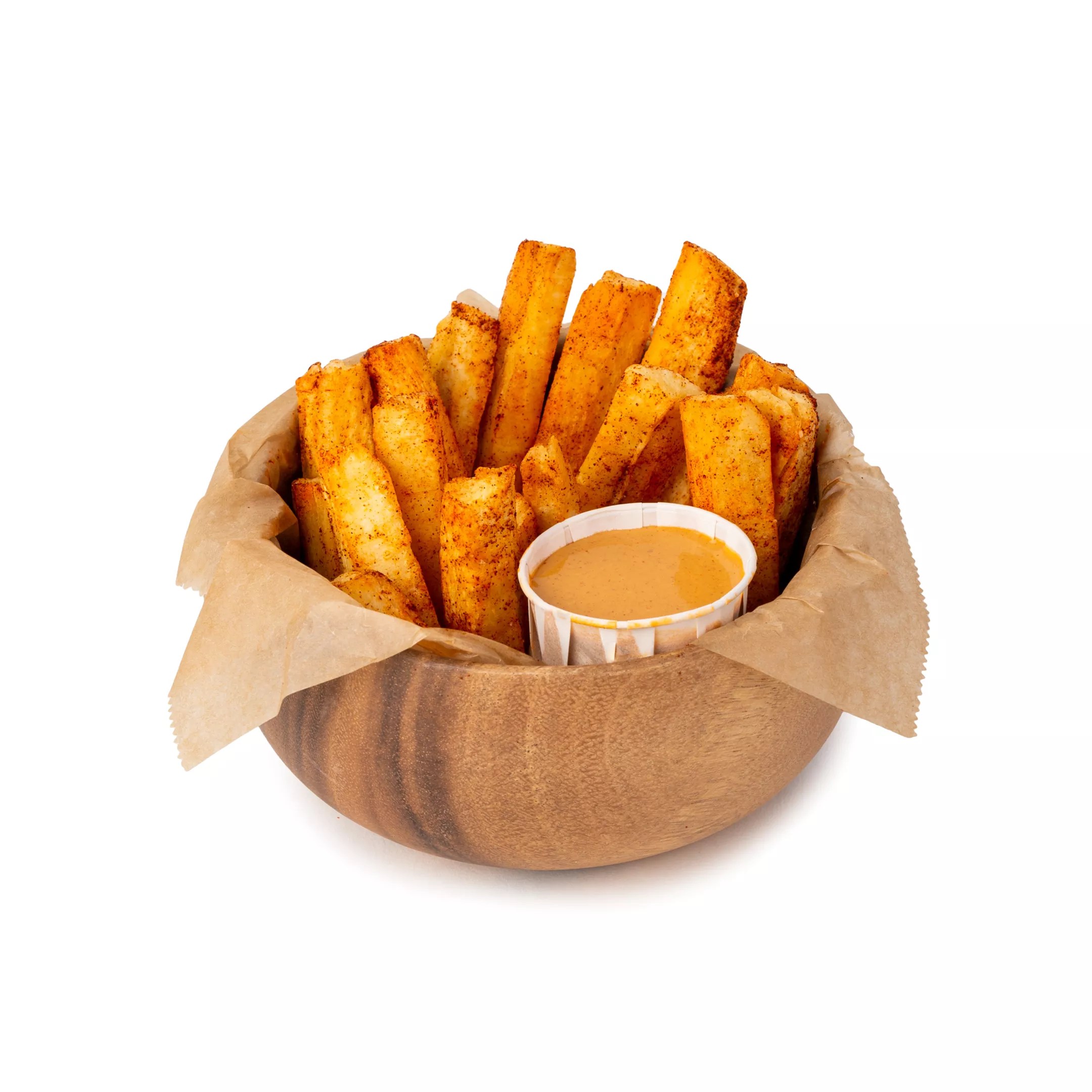 Yuca fries are tossed with smoky spices and served with a choice of one of Arepa Fresca’s three signature sauces.