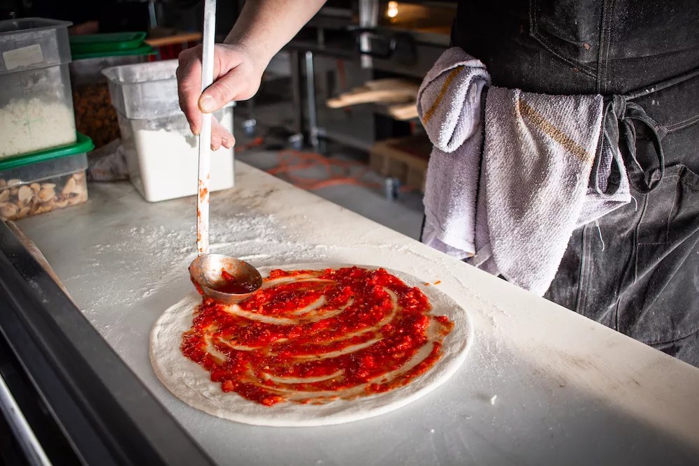 The pizzas use a different starter than the bread; it’s left to activate for 48 hours to develop the acidity desired. Once mixed and proofed, the pizza dough needs to be used within 24 hours, a relatively small window.