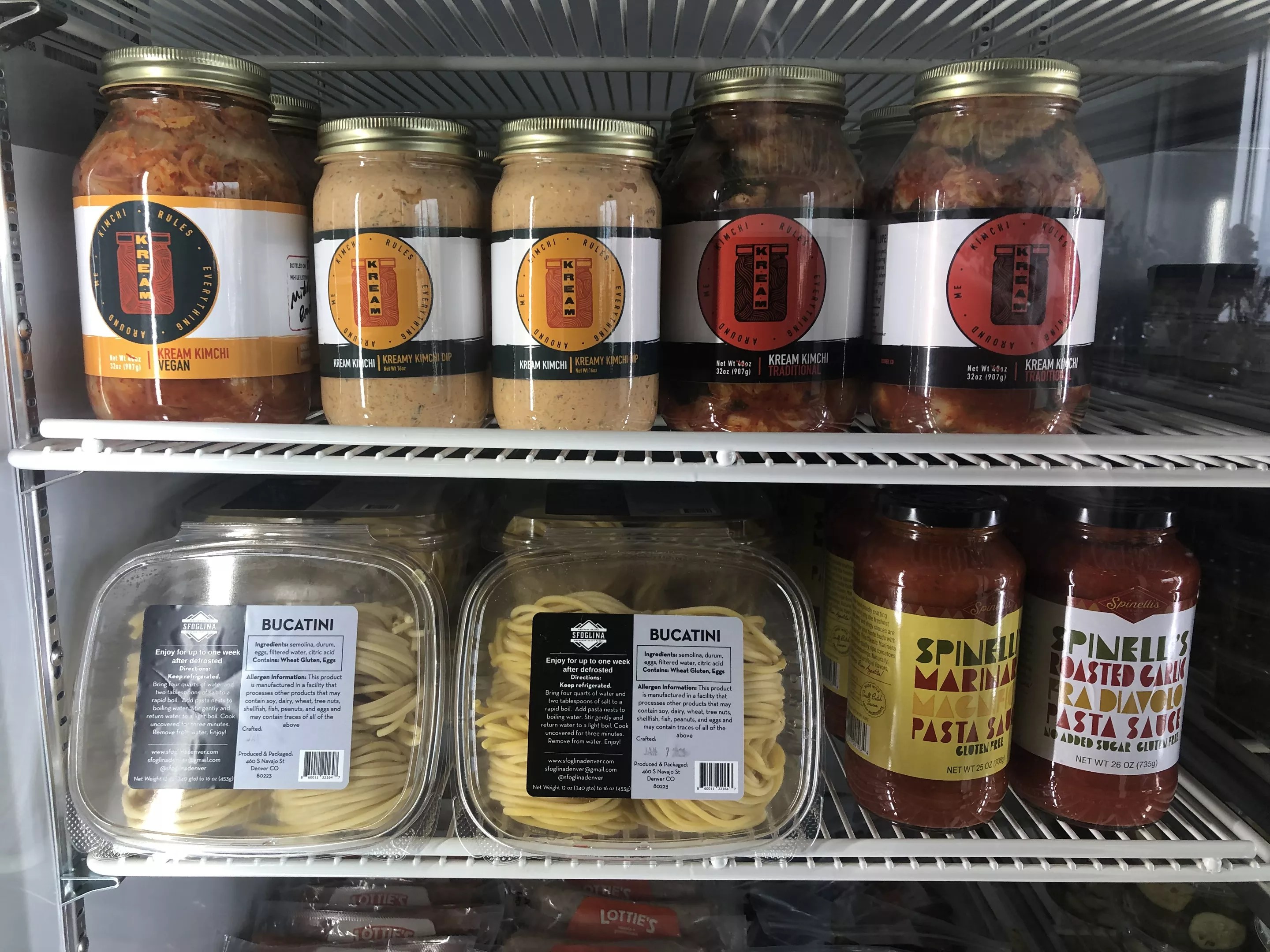 At present, offerings include house-prepared products such as olives, hummus, tomato pesto, granola, mustards and more. There are also several products from local brands such as Kream Kimchi, Sfoglina Denver’s dried (and fresh) pastas, and Elevation Meats & Charcuterie.