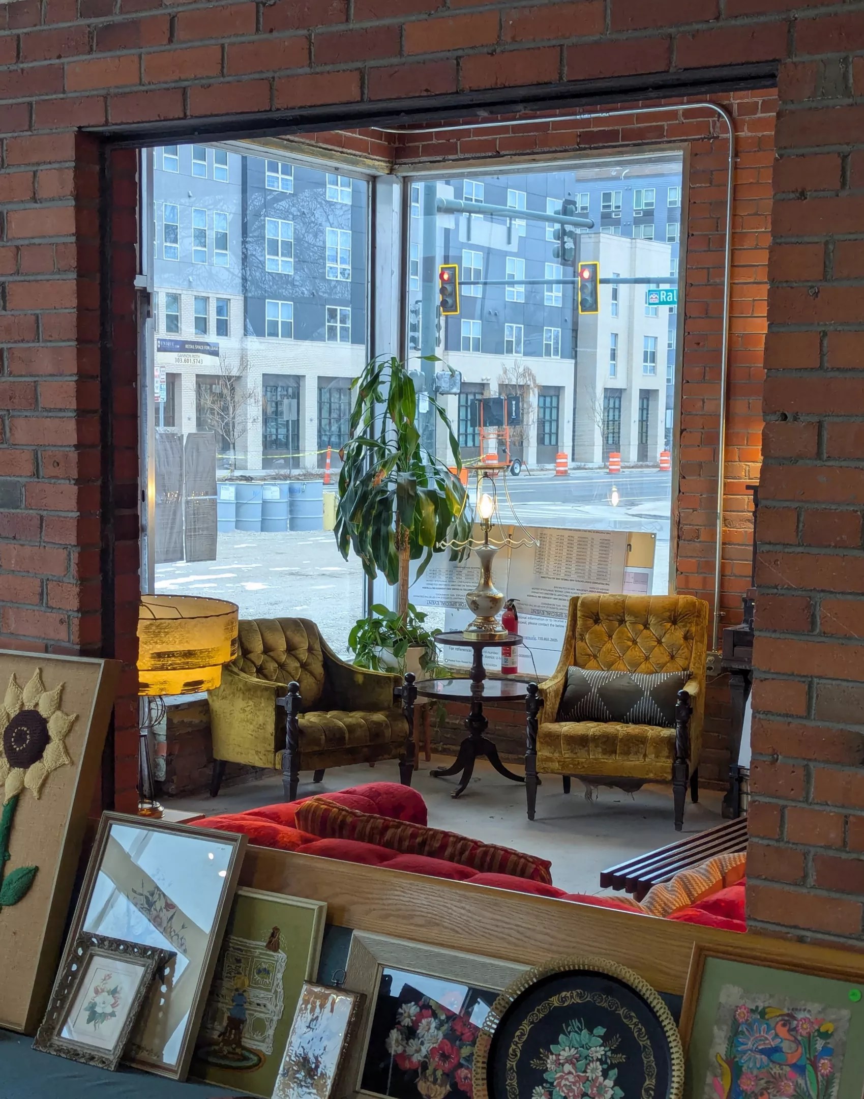 Much of the charm of the space came from exposed brick and natural light from the garage door inherited from its past life as a tire shop, accented by velvet furniture and lots of plants. “Our goal was to try and refine what was already there, so we kept all of the brick elements and brought in a designer who’s a vintage collector,” says Haygarth. “We want to have this cozy conversation den effect, but people still come and work comfortably with warm and cozy vintage elements.” They also paved the patio for additional outdoor seating.