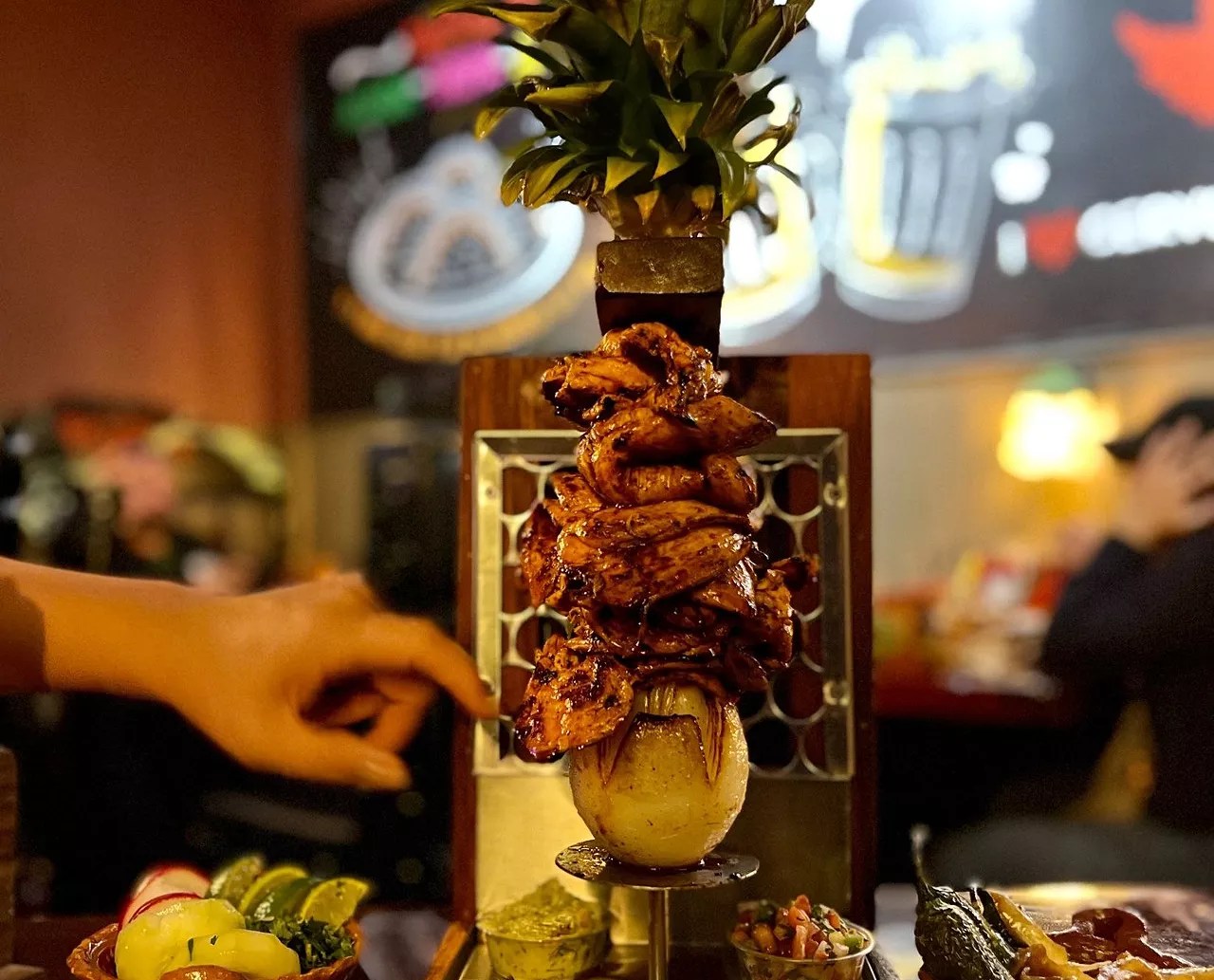 The inspiration for the dish came from eating chicken skewers from Mexican street vendors, Jauregui explains. After sampling many different versions, he perfected the marinade and added his own spin on the dish by flipping it vertically, like a mini shawarma.