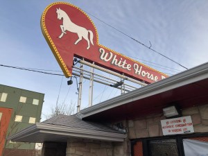 The White Horse Bar has been pouring since the ’20s – and it looks it. The current owners bought it in 1974 and have made relatively few improvements. An obsolete dance floor in the middle of the room is surrounded by dingy floral carpet, and many of the theme-keeping white-horse statues, paintings and plaques are permanently stained yellow. While the red/green/yellow twinkle lights strung along the booths and the neon-backlit glass bricks below the bar are wonderful touches, our favorite detail is the Coors poster hung on the wood paneling behind the corner stool: It shows an apron-clad E.T. wiping a spotless bar with a rag and this message: “If you go beyond your limit, please don’t drive. ‘Phone Home.’”