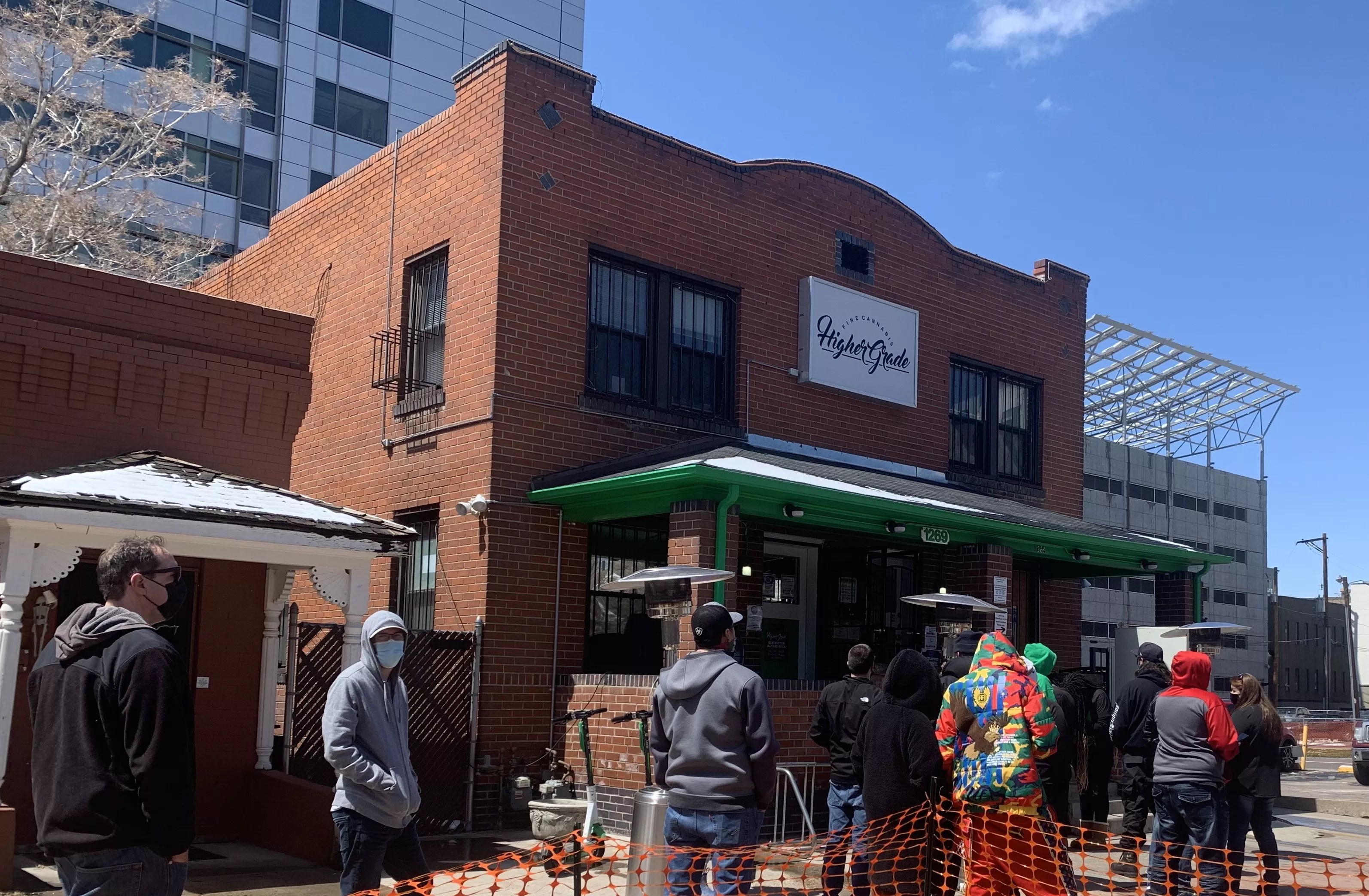 Customers wait outside Higher Grade dispensary in the Golden Triangle.