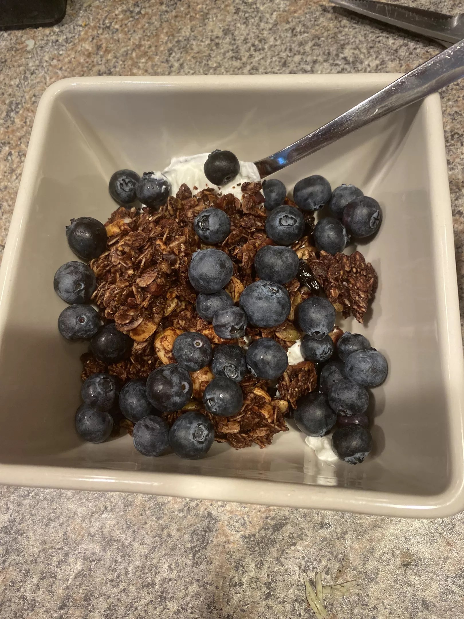 Chocolate-and-cherry granola with Greek yogurt, blueberries and about 100 milligrams of THC.