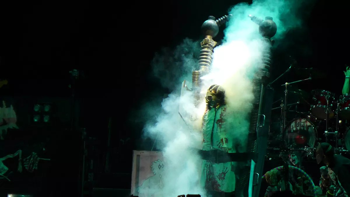 What has long separated Cooper from many of those he influenced is that his songs transcend the spectacle, and the spectacle serves the music. When Cooper appeared on stage in a straitjacket last night while being tormented by a creepy nurse, for “Ballad of Dwight Fry,” it was easy to forget that it was one of the earliest hard-rock songs to thoughtfully address mental illness and depression. Cooper’s campy theatrics highlight the isolation and despair the song’s all about.