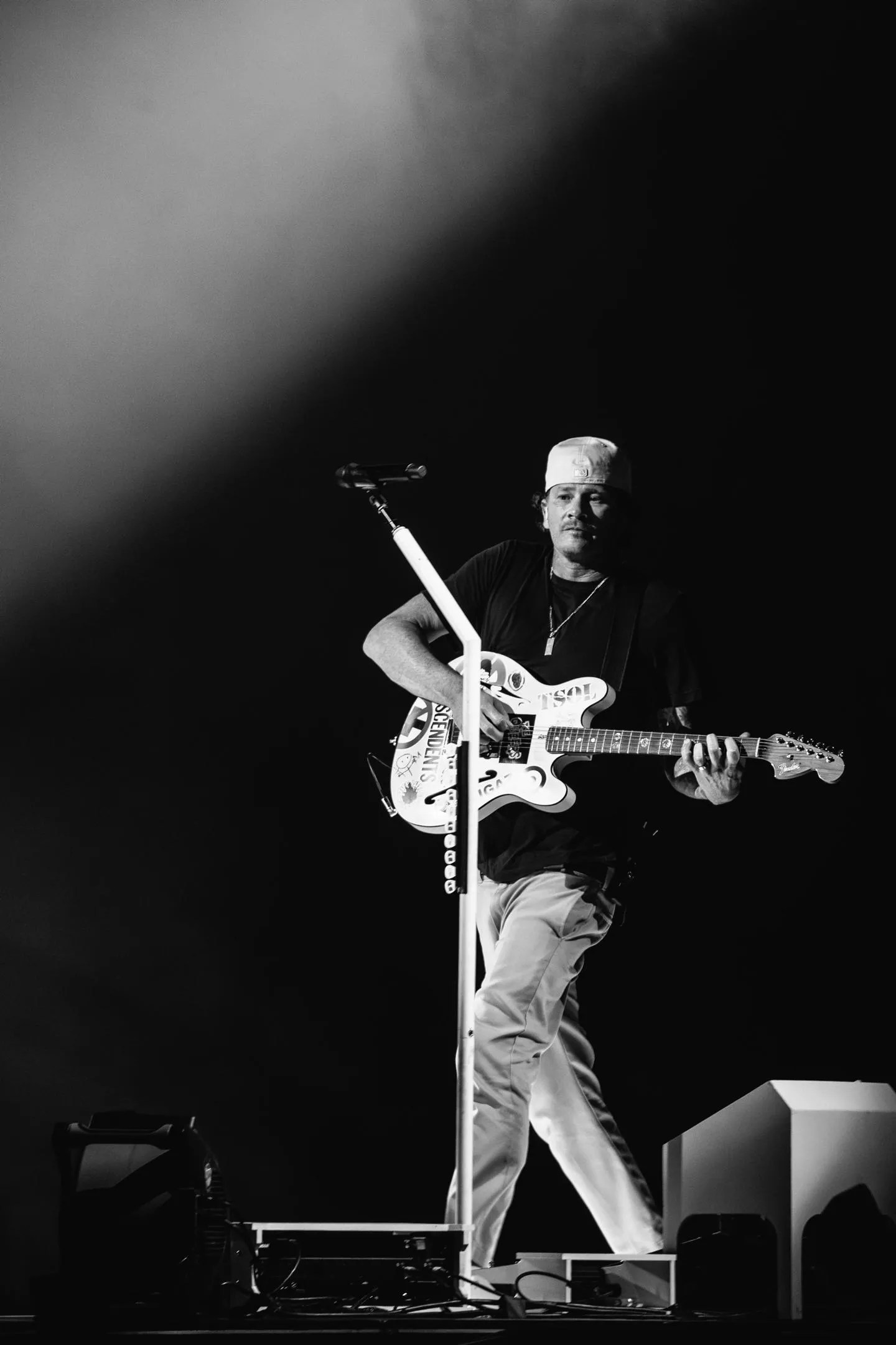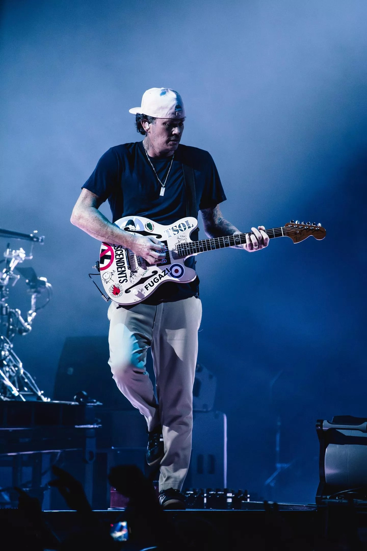 Tom DeLonge’s guitar includes stickers for SoCal punk bands Descendents and TSOL.