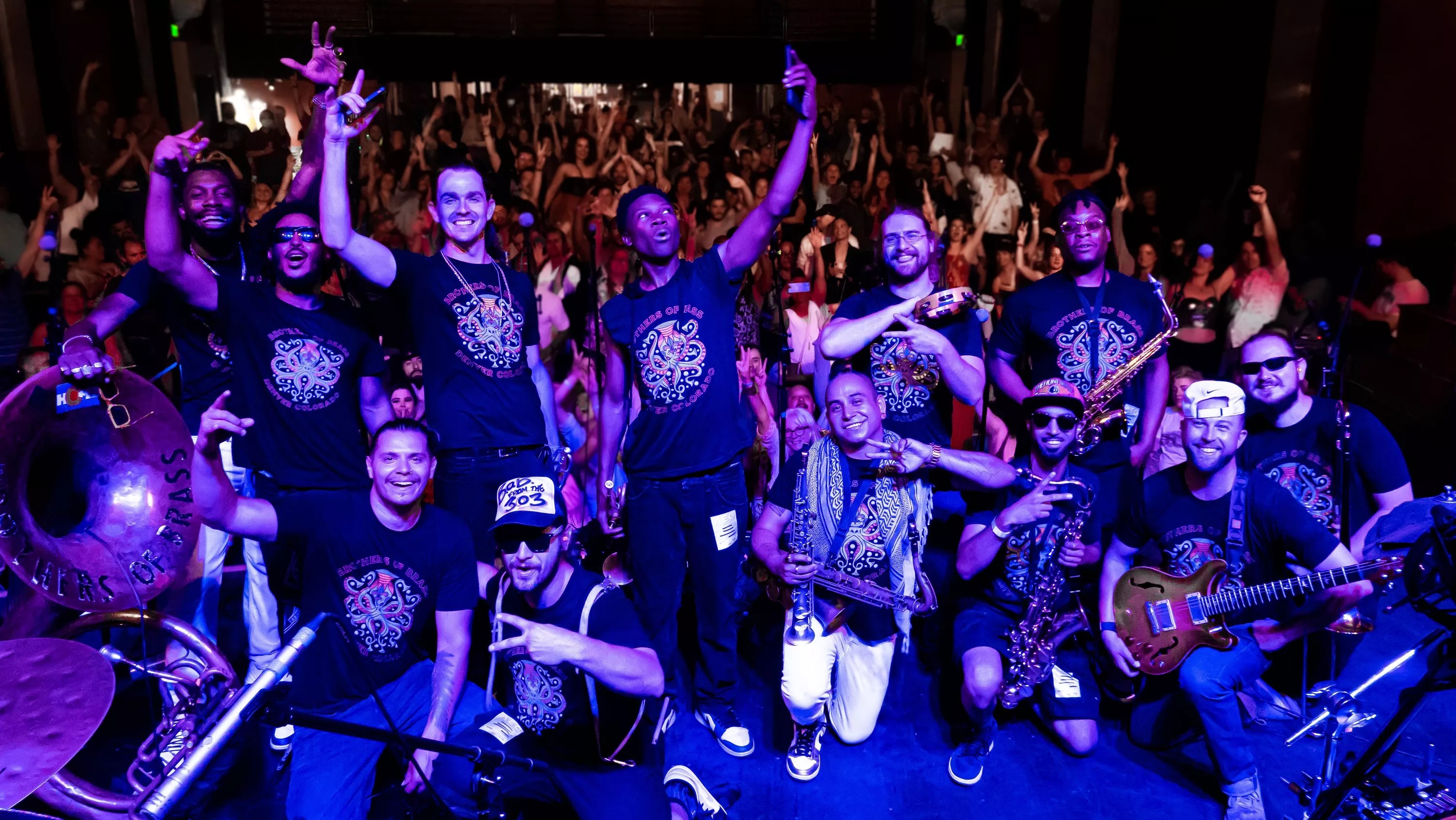 Simon moved here permanently in August 2016, and what he calls the “official Brothers of Brass” formed with him, Lopez, and Herman on snare drums. Since then, they have remained the core members, working with a rotating cast of bandmates. “In addition to being a band, I like to think of it as an enterprise. We just have a lot of different scenarios, different products, different ways that the band shows up, and those require different people,” Lopez explains. “I think our call list is probably something like thirty people, and our full-timers are probably like a solid eight people.”