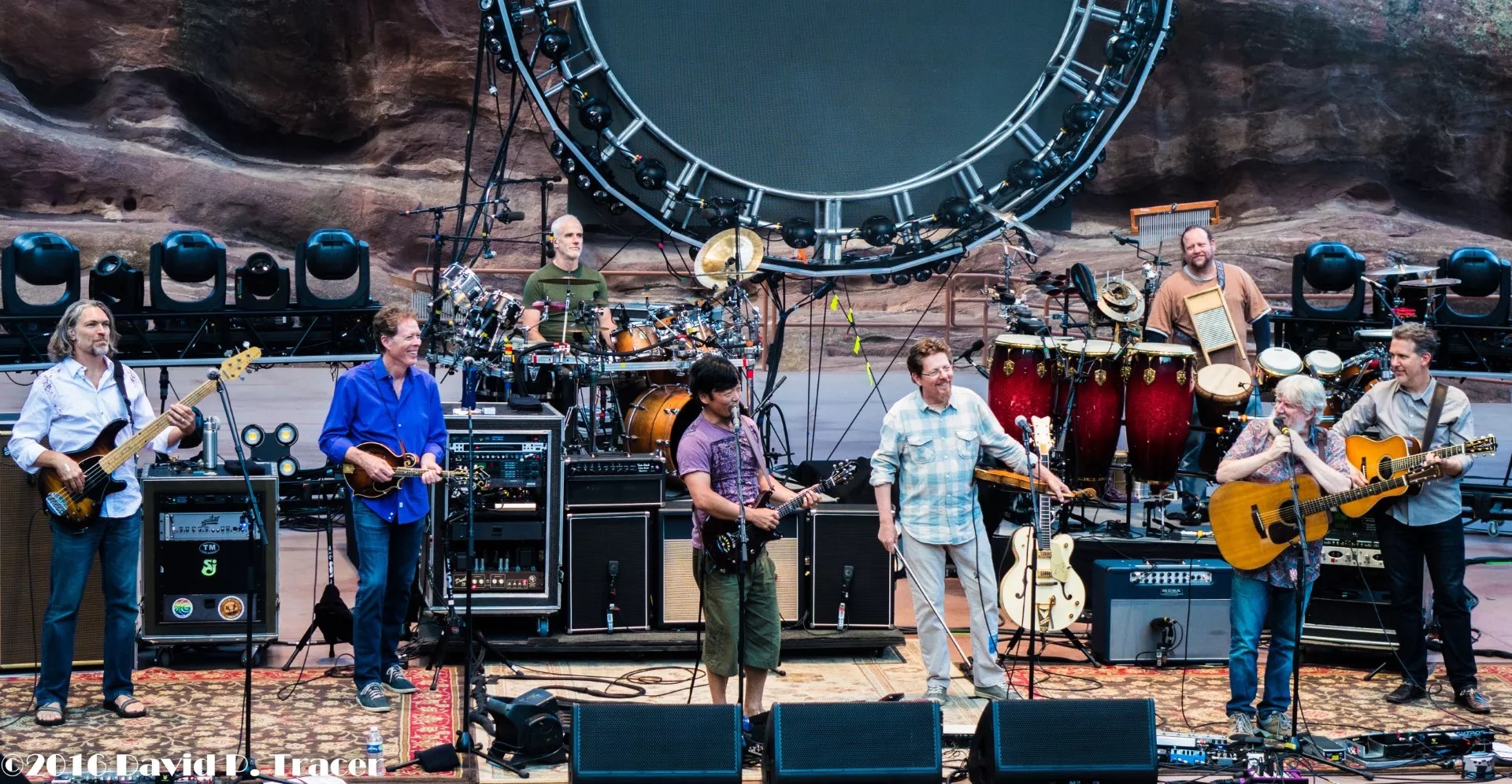 Members of Hot Rize and String Cheese Incident sharing the stage at Red Rocks.