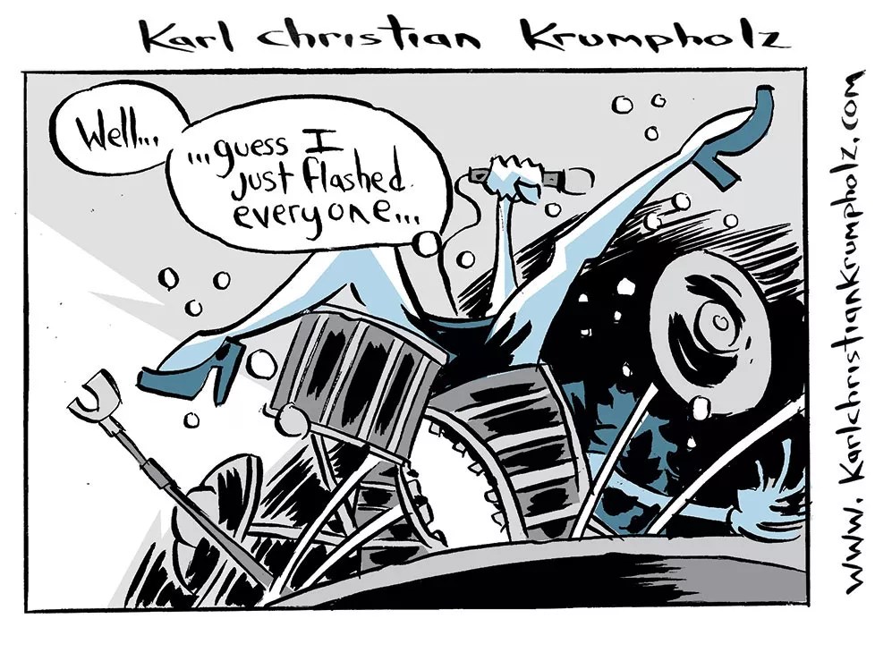 “Holy Mother of God, what a mess! Legs up, the whole nine, as I’m thinking, “Well, I’ve just flashed the whole world.”