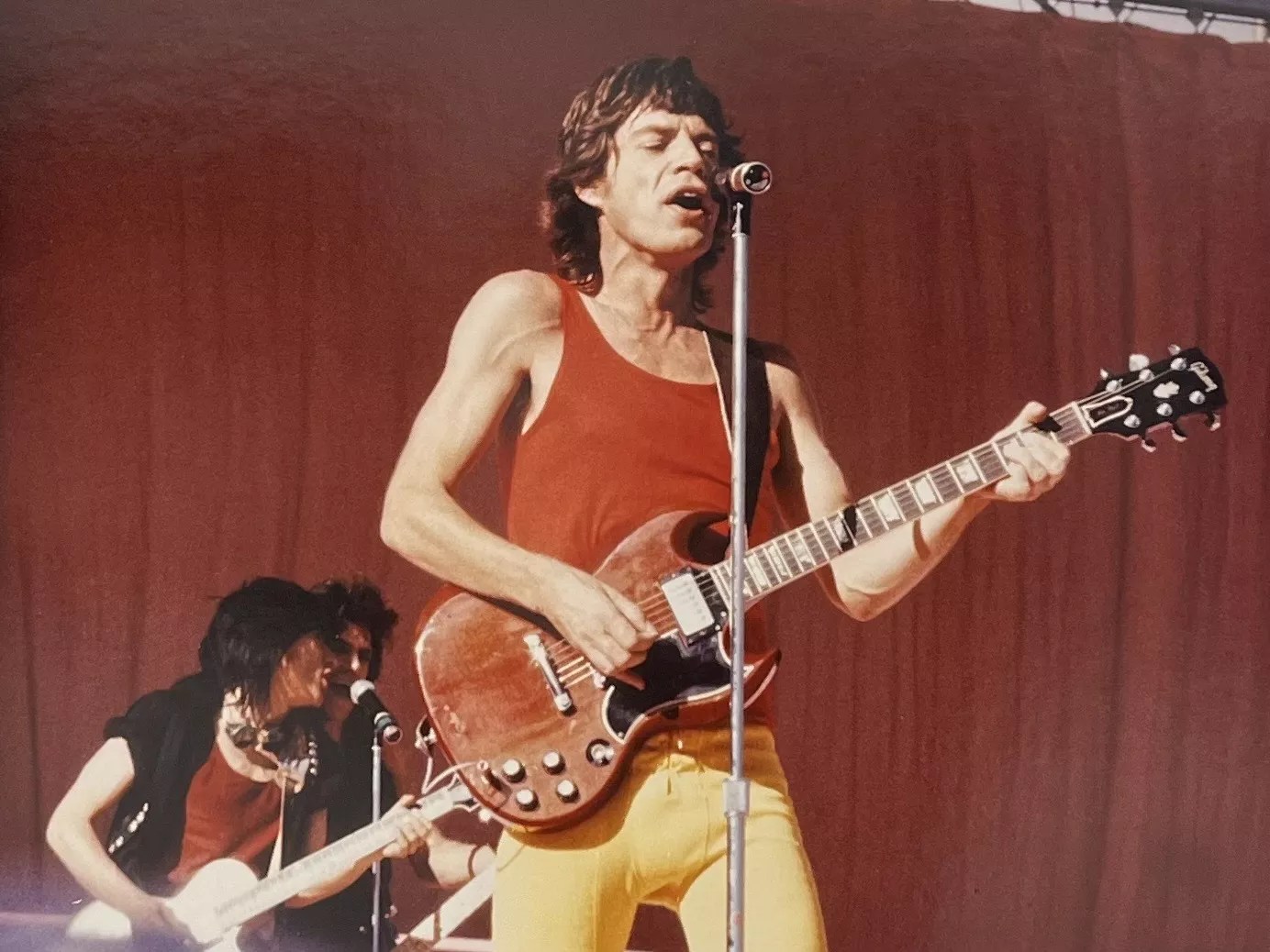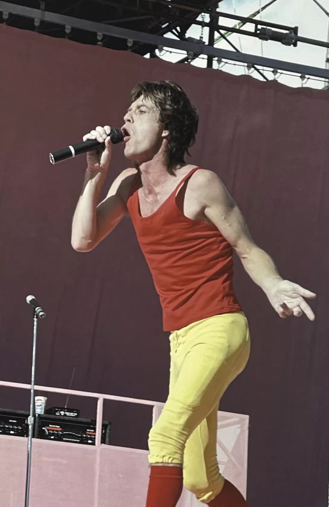 The photographs depict the spirited, high-octane energy of the Rolling Stones. One particularly captivating image shows Jagger in the center looking like an off-duty Ronald McDonald in a bright red tank, matching knee-high socks and yellow baseball pants, singing into the mic as Richards and Wood make eye contact behind him, bowing over their instruments. It’s almost as if you can hear the blare of an amp from the photo. Other images give the impression that Jagger was intentionally modeling for them; in one, the singer has his right arm angled high, with the mic pointing directly down towards his head. His eyes are closed, lost in a dance, and his left arm is mid-way through a sweeping motion, his fingers artfully splayed.