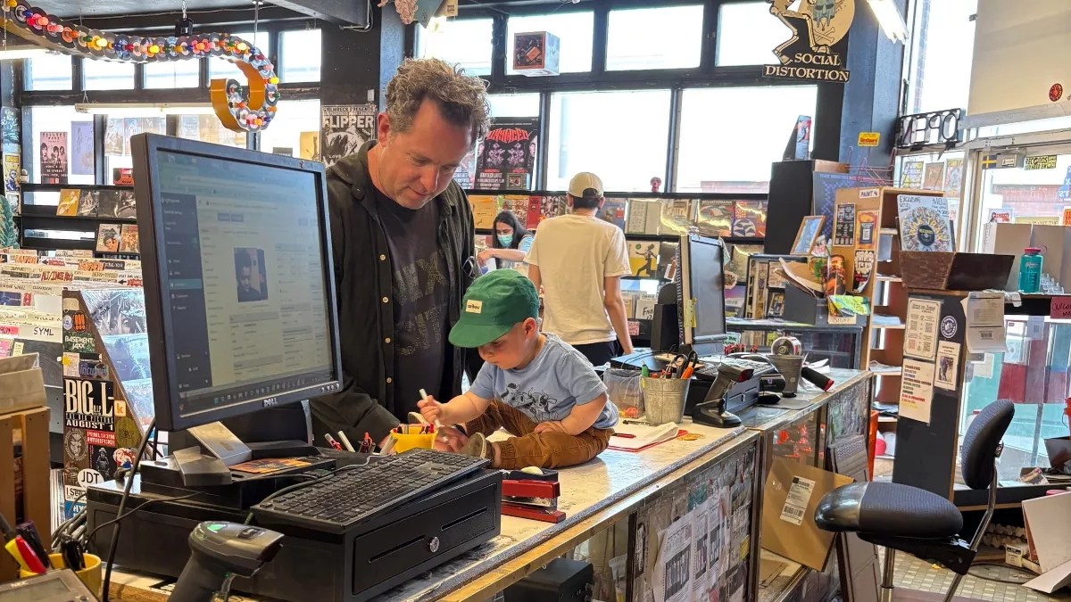 Pete Stidman and his son Odo Stone Stidman at Wax Trax’s 638 East 13th Avenue headquarters.