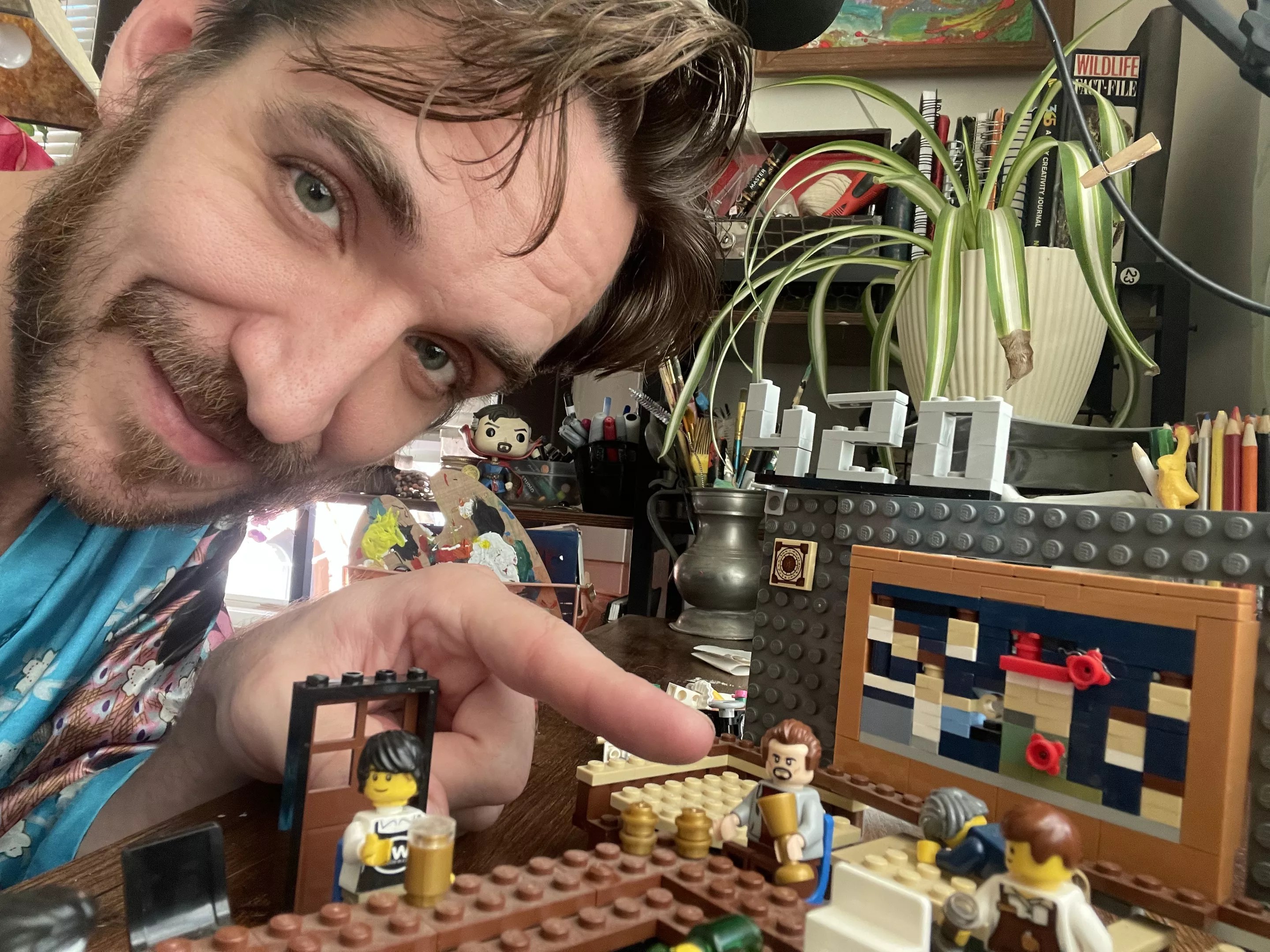 Zachary Lamb points at the LEGO version of himself in his replica of Nob Hill Inn.