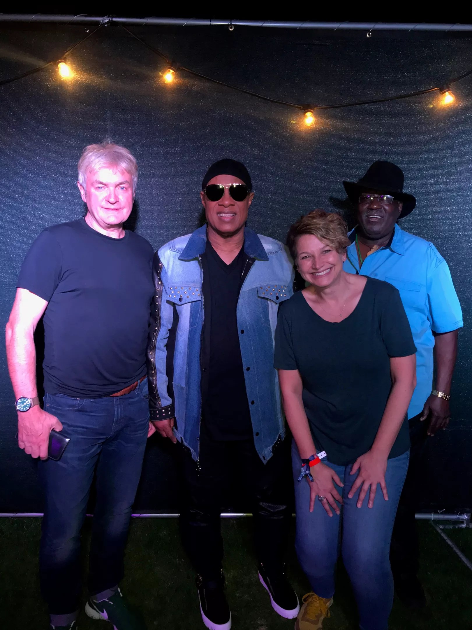 Kevin Nixon and Sarah Clayman of DIME Denver pose with Stevie Wonder and his bassist Nate Watts.