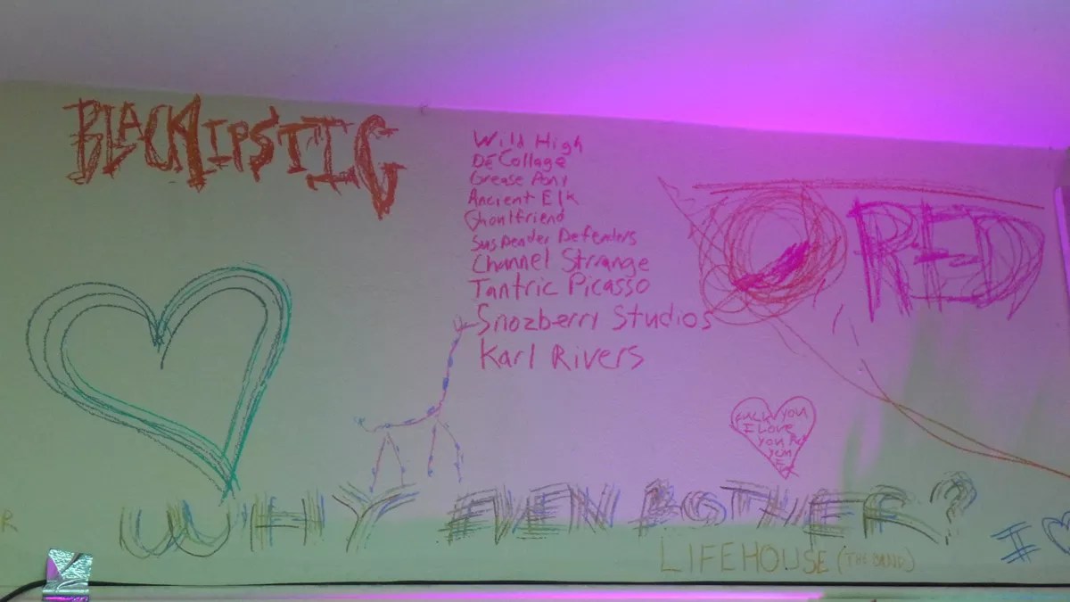 At its final event, the Moon Magnet collective showcased its in-house family of artists as well as noise/visual artist orchidz3ro. Guests drew with markers and crayons on walls covered in the space’s signature Mylar sheets. “Not spray paint,” quipped resident musician Trey Tafoya. Other artists produced live artwork inspired by the bands’ music.