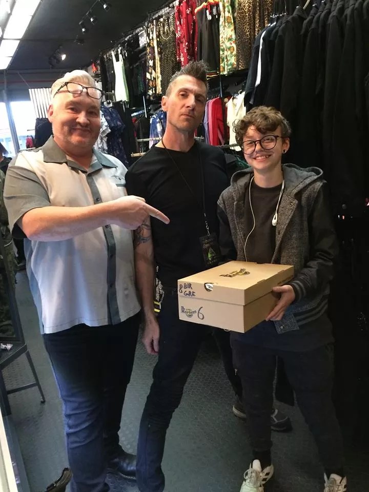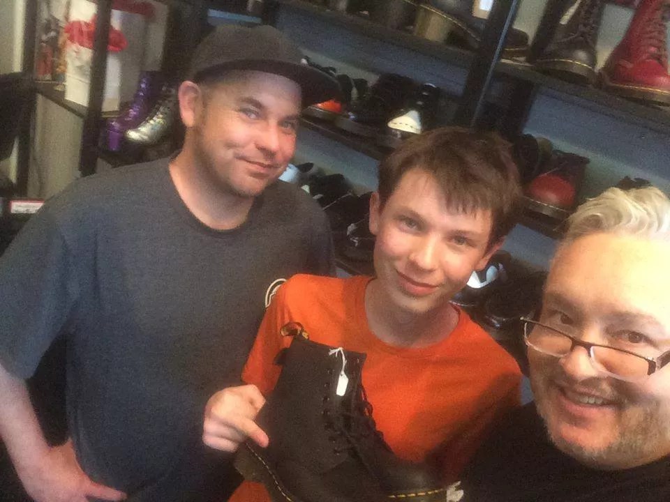 That happened in November last year, when John Bechdel of the band Ministry was in the shop and posed with a young man selecting a pair of Dr. Martens. Al Jourgensen’s partner, Liz Walton, took the photo of the grinning teenager along with Bechdel and Italiano, which Italiano captioned, “Just came in for his first pair of doc’s!!! – and a photo with a huge ass rock star!! SWEET!!! Ministry in the house!!! he went with the 8 black greasy, John from Ministry got the Joy Divisions boots!! what a day!.”
