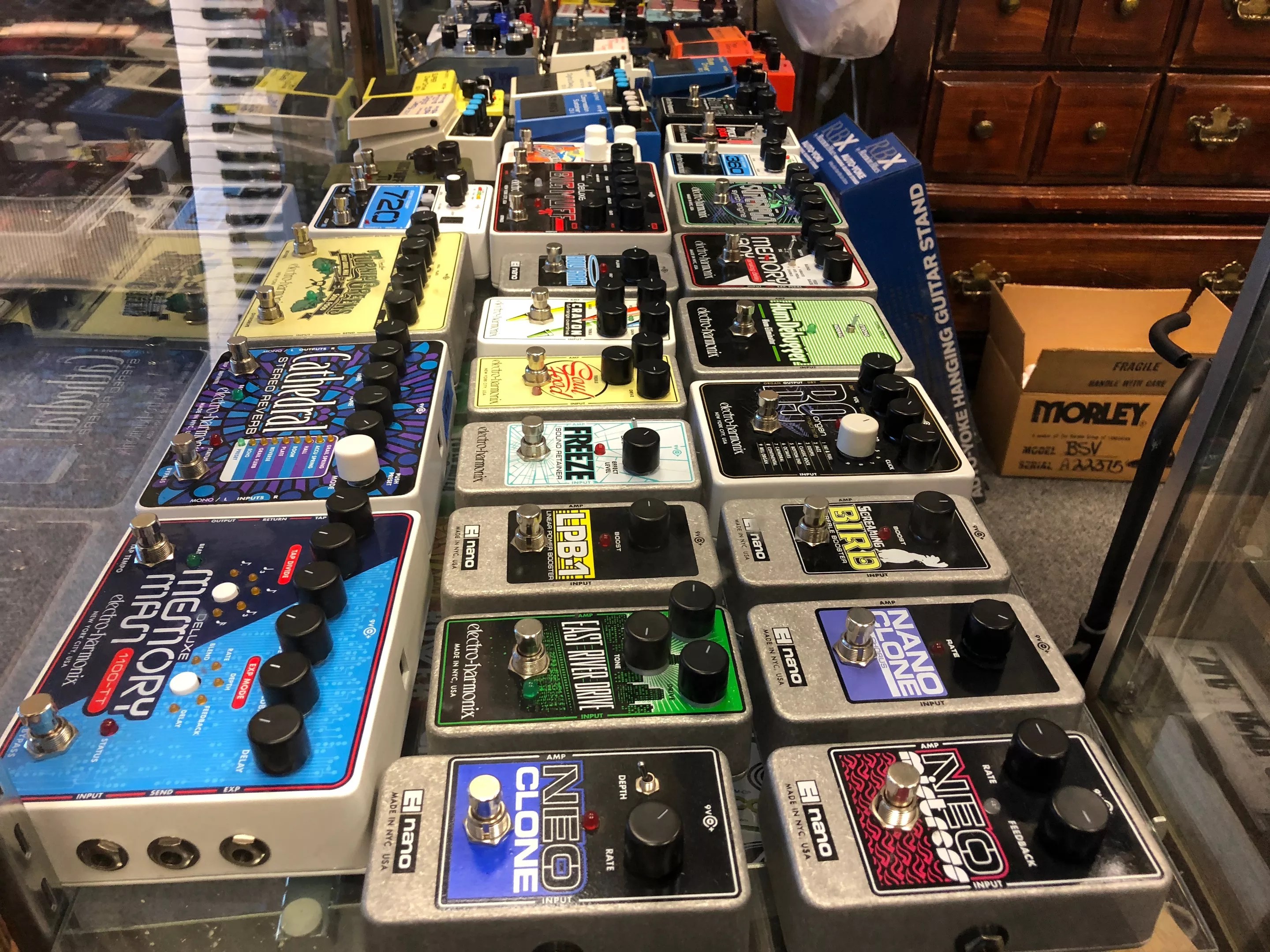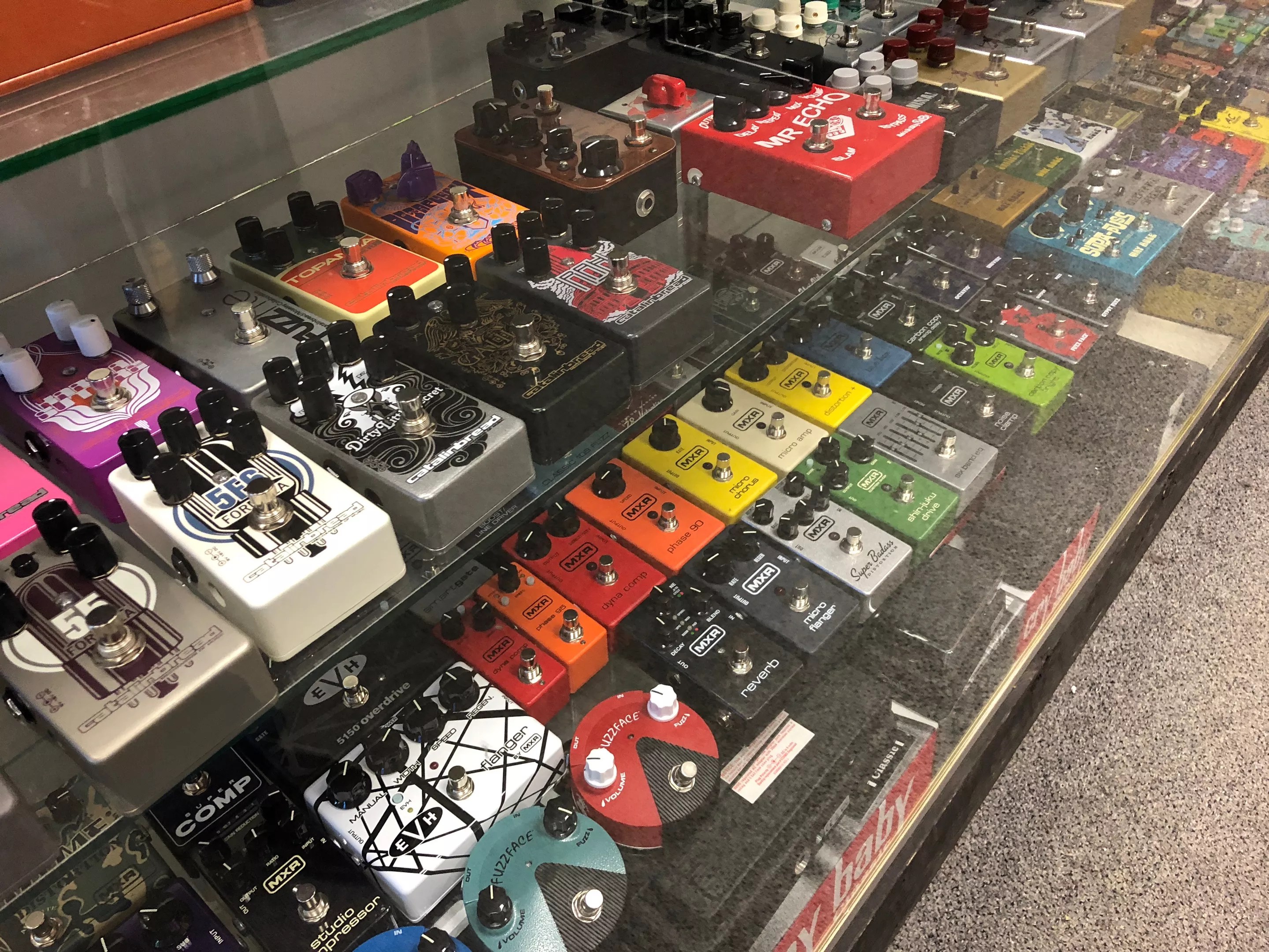 Some of the more than 350 guitar effect pedals at Flipside Music.