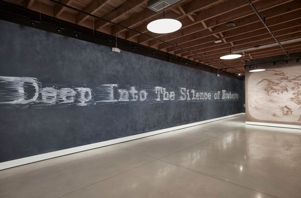 “It’s a really good fit [for NOENEMIES],” he adds, “because a lot of Gary Simmons’ work is about erasure. Physically, words on a wall fading. So in the tradition of protest songs, you’re constantly filling in new words to speak to new moments. There’s a type of song called a zipper song where you’re singing the same basic song but subbing in new language to fit the thing you’re dealing with in the moment. So the idea that we’re writing our own present history by singing these songs, looking back at what the words have had to be in past moments and learning from that and creating something new in the moment–it’s a beautiful juxtaposition, I think. The interplay between the walls and the words being sung will be a piece of performance art in and of itself.”