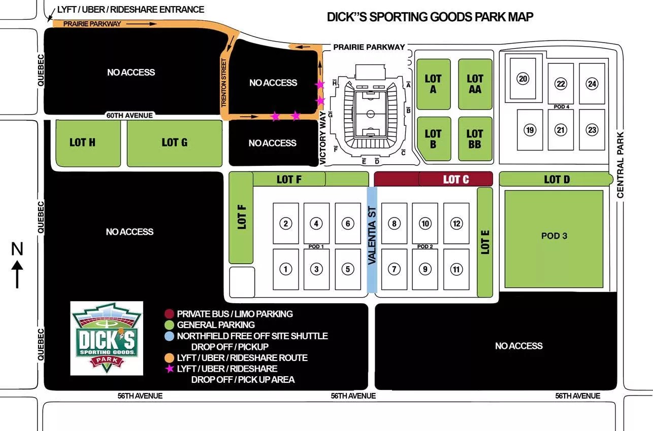 The route to the rideshare pick-up/drop-off area is Quebec Street to Prairie Parkway. Type “DICK’S Sporting Goods Park” into your app as your destination, and drop-offs will be located at Victory Way/East 60th Avenue. After the show, the pick-up location will be on the west side of the stadium at Victory Way/East 60th Avenue. You will still use your app to request a ride as normal. The DSGP map denotes the drop-off and pick-up areas. Signage will be placed outside the stadium for directional assistance.