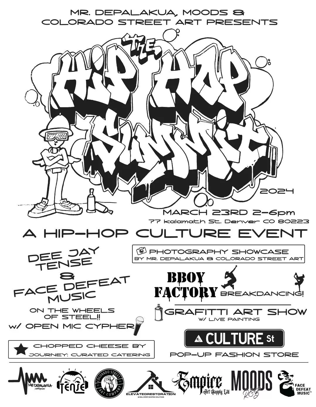 That’s what De Palo wants to bring to Denver with the inaugural Hip-Hop Summit, the event he’s throwing on Saturday, March 23, with Adam Clark of Colorado Street Art and BJ Quarles, a promoter for Moods R&B who is the general manager at ABC Imaging. That quiet print shop at 77 Kalamath Street will soon be bursting with the energy of ’90s-era MTV, emulating those renegade gatherings of hip-hop’s glory days.