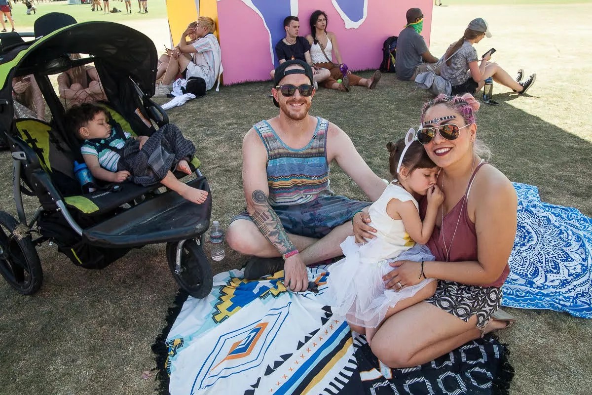 When Ben and Claudia Adams brought their first child, Florence, to Coachella in 2015, she was just over a year old. This year, they’ve returned with her for round two, along with her one-and-a-half-year-old brother, Phoenix. He slept in the shade of one of the festival’s massive art installations while his parents and sister caught Glass Animals’ set from afar.
