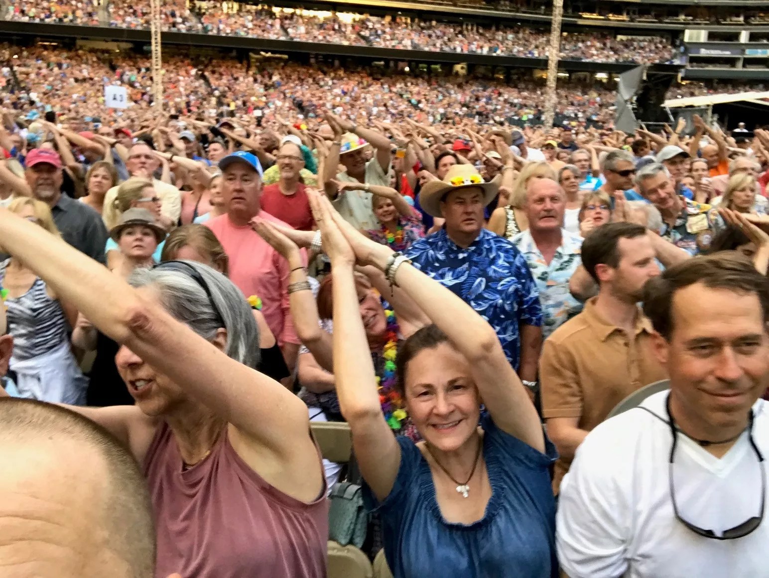 Whatever the arc of his performance, Buffett’s land sharks had taken the bait and were singing along and dancing to every corny move: “Fins to the left; fins to the right.”