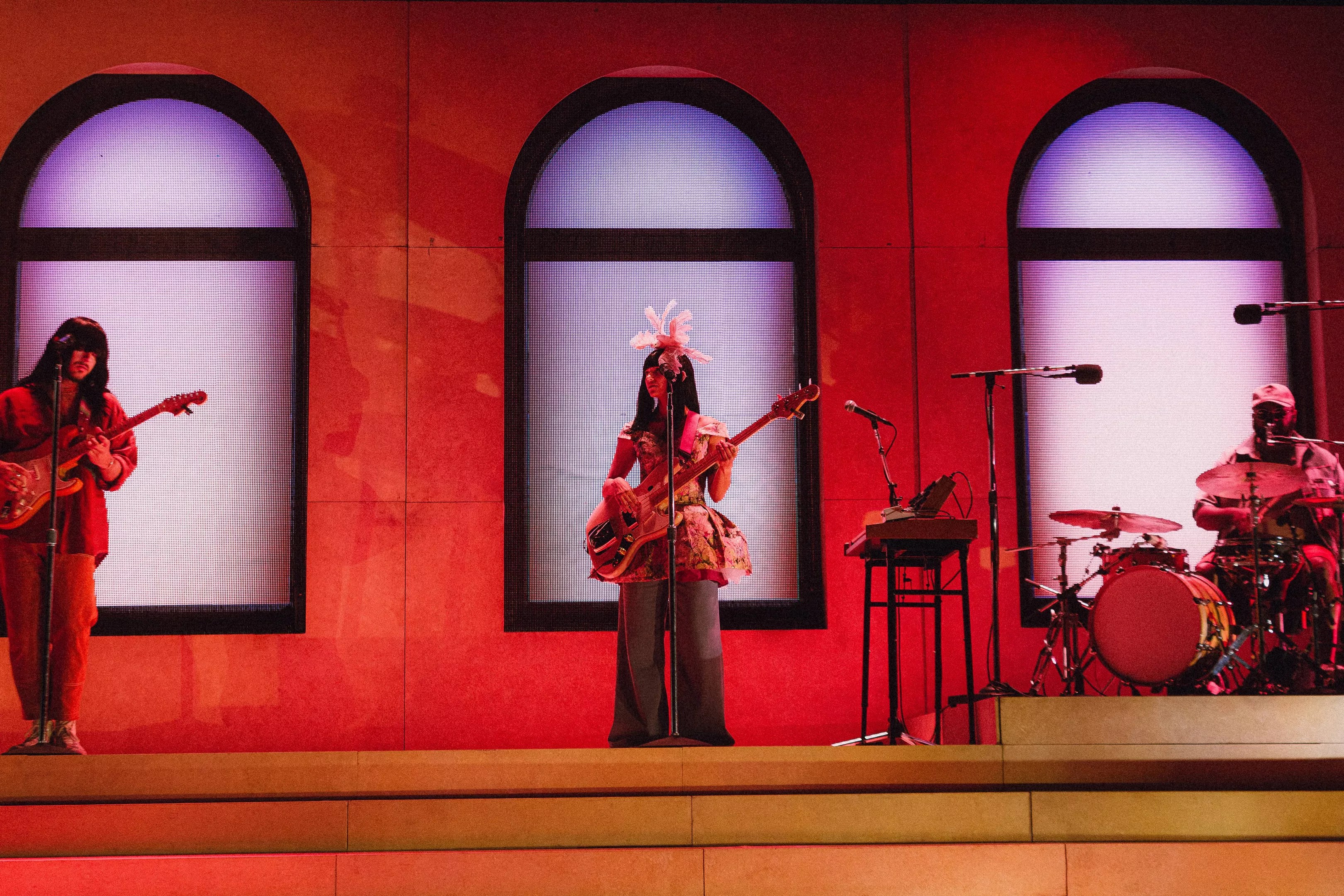 The stage was set with a backdrop of three arched windows above a platform with multiple stairs leading down to the rest of the stage, and was flooded by meticulously chosen colors that perfectly reflected the sound – sherbets, rainbows, deep blues and lavender. Many people have asked what it’s like to have synesthesia; going to a Khruangbin show would give you a good idea. The colorful lights that paired with the music were precisely what I experience when streaming the band’s music.