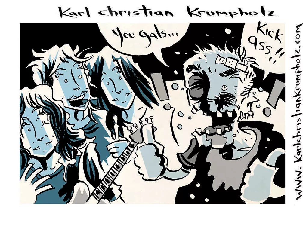Madi Pietruszka: “We were all glammed up and stuck out like a sore thumb. We didn’t know very many people in the music community and did our best to socialize before our set. We were about to go on, and I couldn’t find our bassist, Jessica, and guitarist, Breanna, at all. I kept calling until Jessica finally answered her phone and told me that they had clogged the only toilet in the place. They were both trapped in the bathroom, not knowing what to do, and there was a huge line of angry people waiting to get in. All I could do was sit on the stage by my drums and wait for them to get their shit together – literally.
