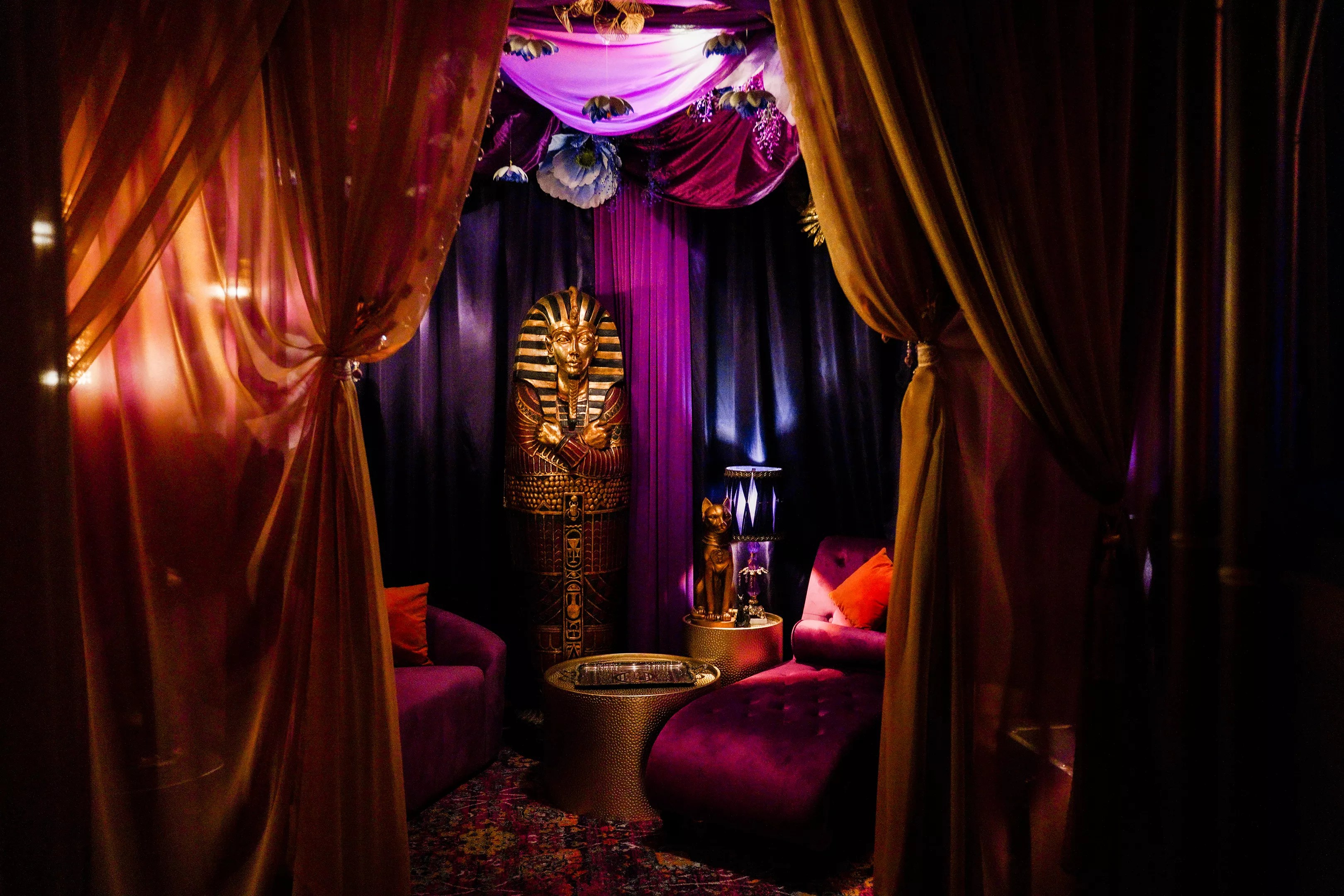 Mockingbird is definitely brimming with lively creativity. Love, who designed the Chambers of Connection, says she modeled each of the three rooms after Egypt, Japan and India, represented by flowers and animals from those countries. The Japan lounge has cherry blossoms hanging from its ceiling, Egypt pays homage to cats and lotuses with royal-purple wall hangings, and India is brightly saturated with color and lotus flowers. Separated by golden curtains and filled with comfortable furniture to match, these spaces encourage interaction, much like Nocifera’s own design of a birdcage right around the corner, between the chambers and the cocktail bar. Rising to the ceiling, the giant cage is lined with a circular bench around a table in the center, making for a communal area where up to sixteen people can cozy up and meet others.