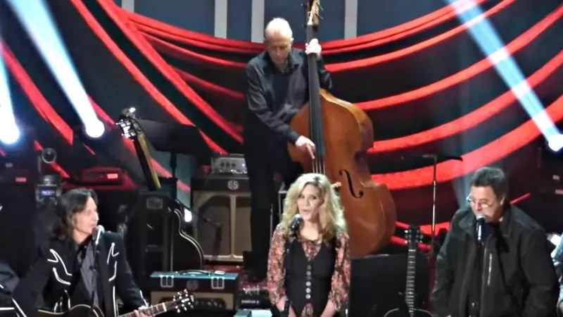 Jeff Hanna sharing the spotlight with Alison Krauss and Vince Gill at the Dirt Band’s fiftieth anniversary celebration in 2016.
