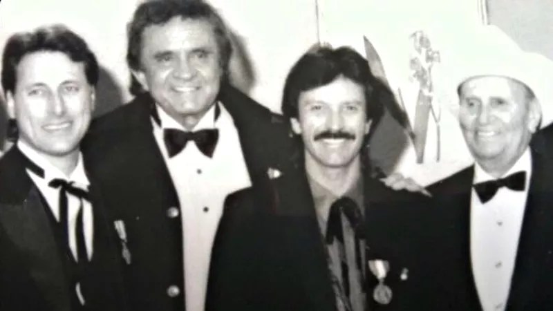 A vintage shot of Jimmie Fadden, left, and Jeff Hanna, second from right, posing with two of their heroes, Johnny Cash and Gene Autry.