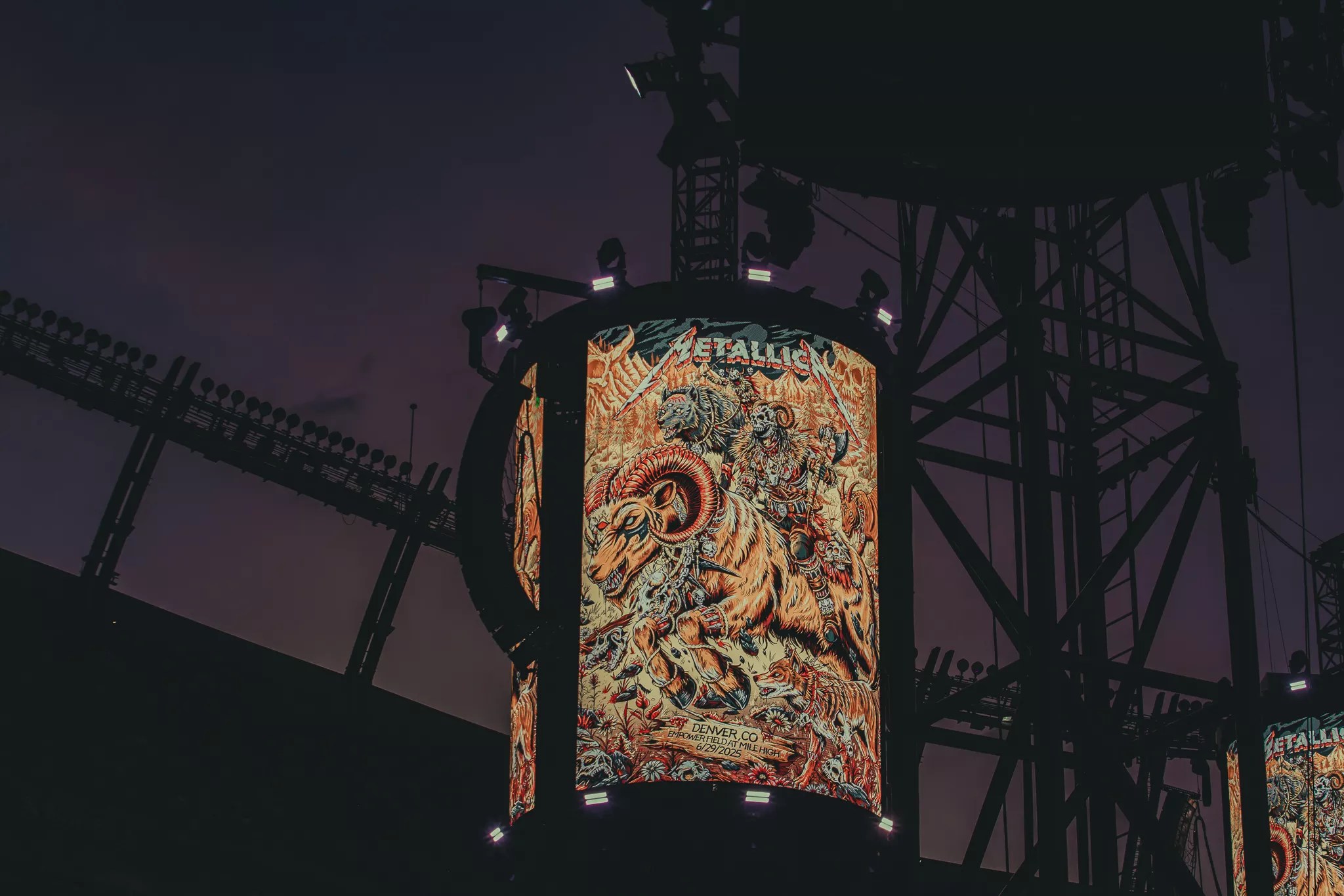 Metallica artwork for night two on display on one of their production towers.