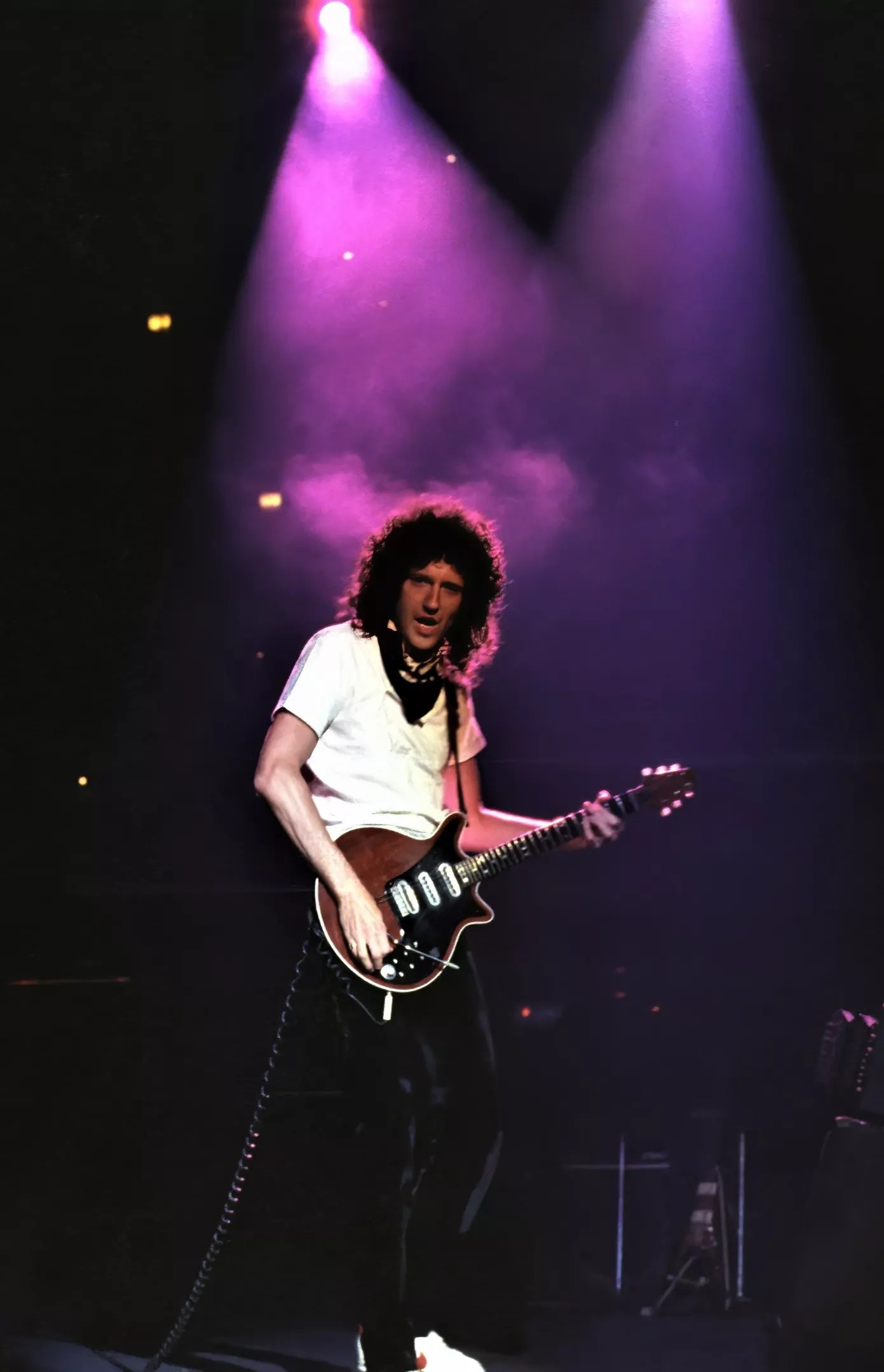 Perea brought two rolls of film with him that night, and developed 47 images. It was tough deciding which ones to include in the exhibit, but there were several obvious choices, such as a gorgeous, enigmatic image of Brian May surrounded by purple smoke. It was one of those dream shots photographers always hope to capture, and Perea can still remember the feeling. “The lights dimmed and then turned blue and purple, it’s kind of hazy. There was no spotlight at that point in time, so I’m looking at him through my lens, and he glances over and looks right at me,” he recalls. “And I click the picture and I’m like, ‘Yes!'”