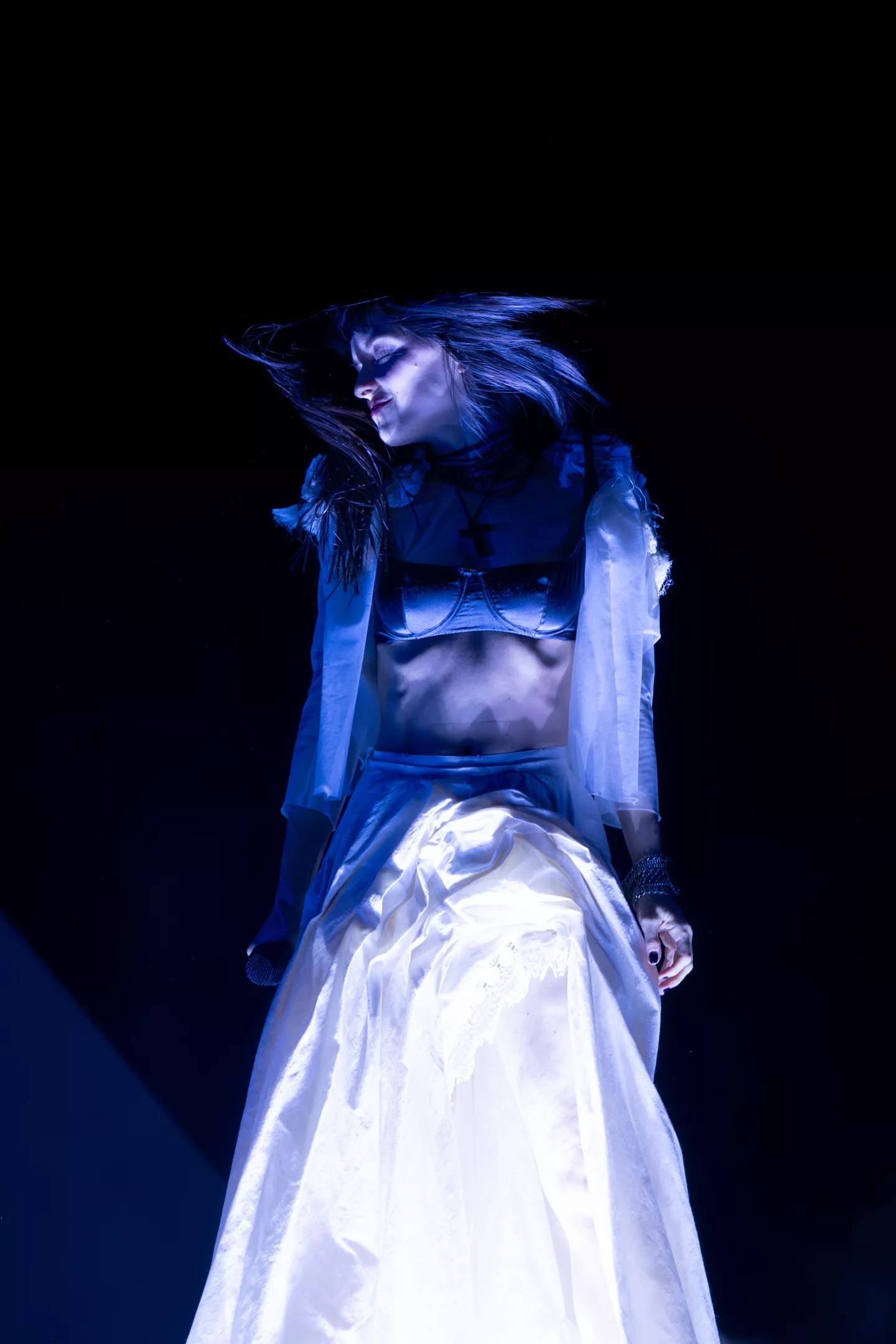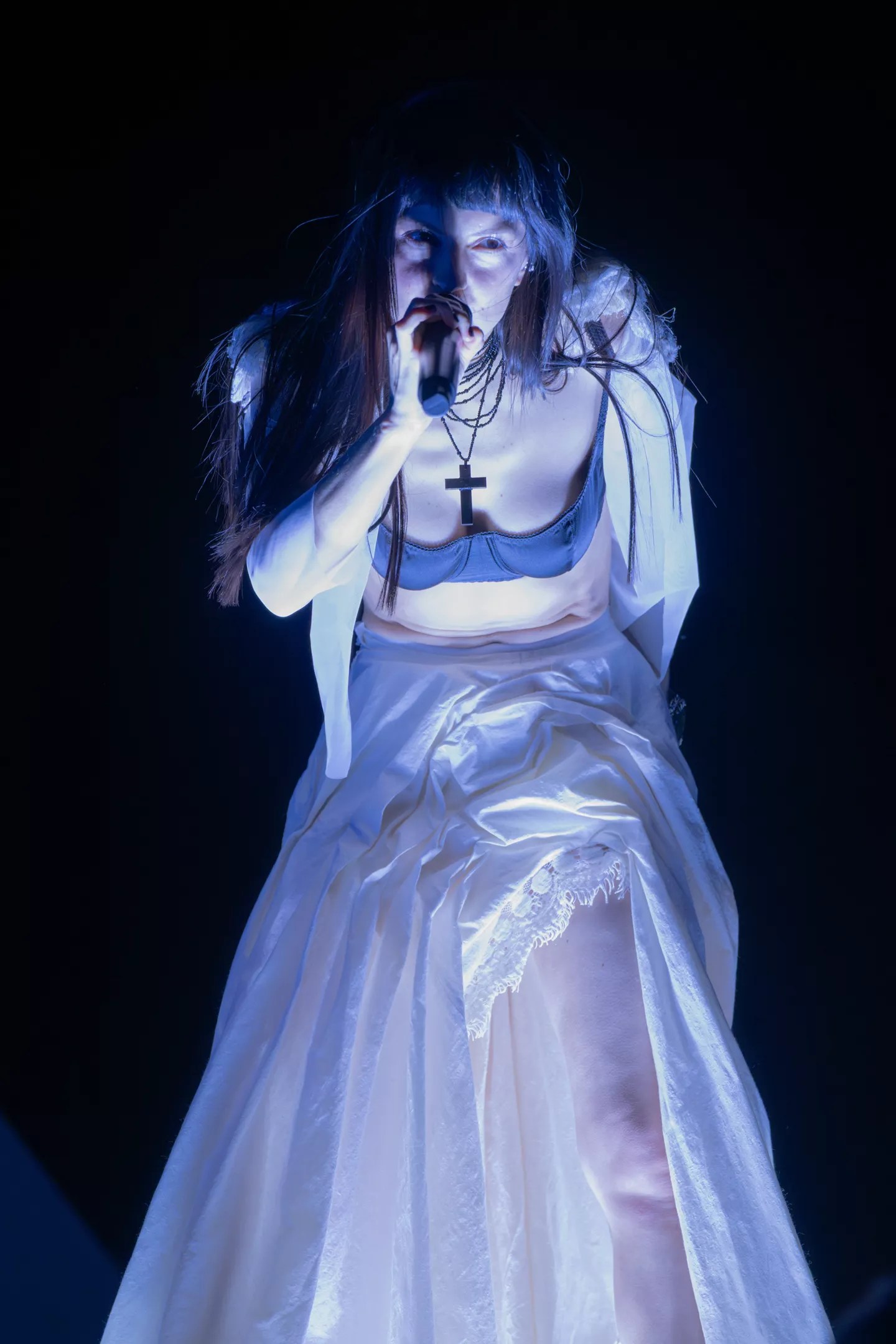 Finally making herself seen on stage, Zardoya was dressed in an open white top, black bra, black cross necklace, flowing white skirt and black platform boots. Swaying across the stage, Zardoya took a moment to speak to the crowd.
