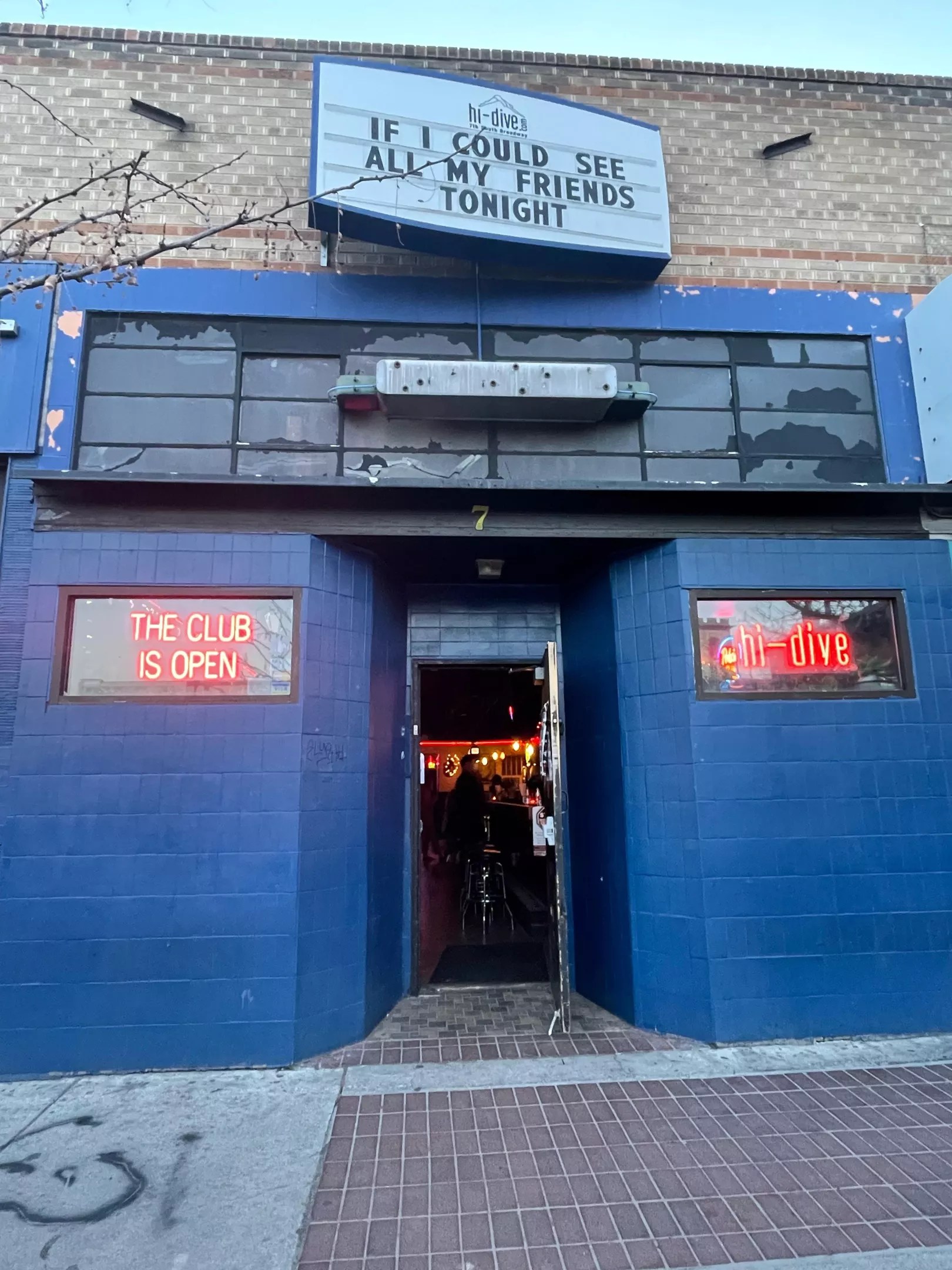 Housley doesn’t remember the inspiration for the hi-dive name, and Clark never really knew where it originated. “There’s a number of different hi-dives all over the country,” Clark notes. “But during the pandemic, the owner of the hi-dive in Kansas City went on Instagram and got every hi-dive in the country and sent a message to everyone that said: ‘Do you guys ever get high and think about how many hi-dives there are?'”