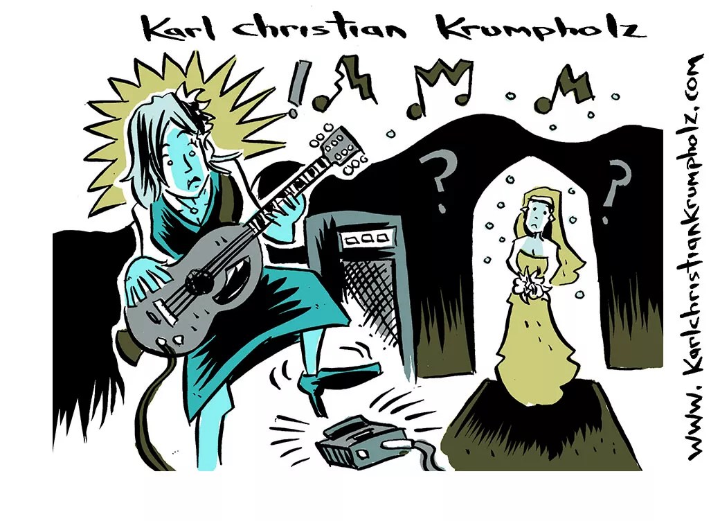 “I laid out all of my pedals and got ready to play this fancy wedding. I had a new looping pedal that was pre-set with the background chords to ‘Pachelbel’s Canon in D Major’ for the bride to walk down the aisle to. There I was, in front of all of these people, and getting paid big bucks to be there. The bride was all ready as I kicked the pedal to start the song. A rap loop started with my children singing an Eminem song out of time and out of sync. The crowd laughed as the bride and I panicked. I kicked the pedal again, and ‘Pachelbel’s Canon’ began.”