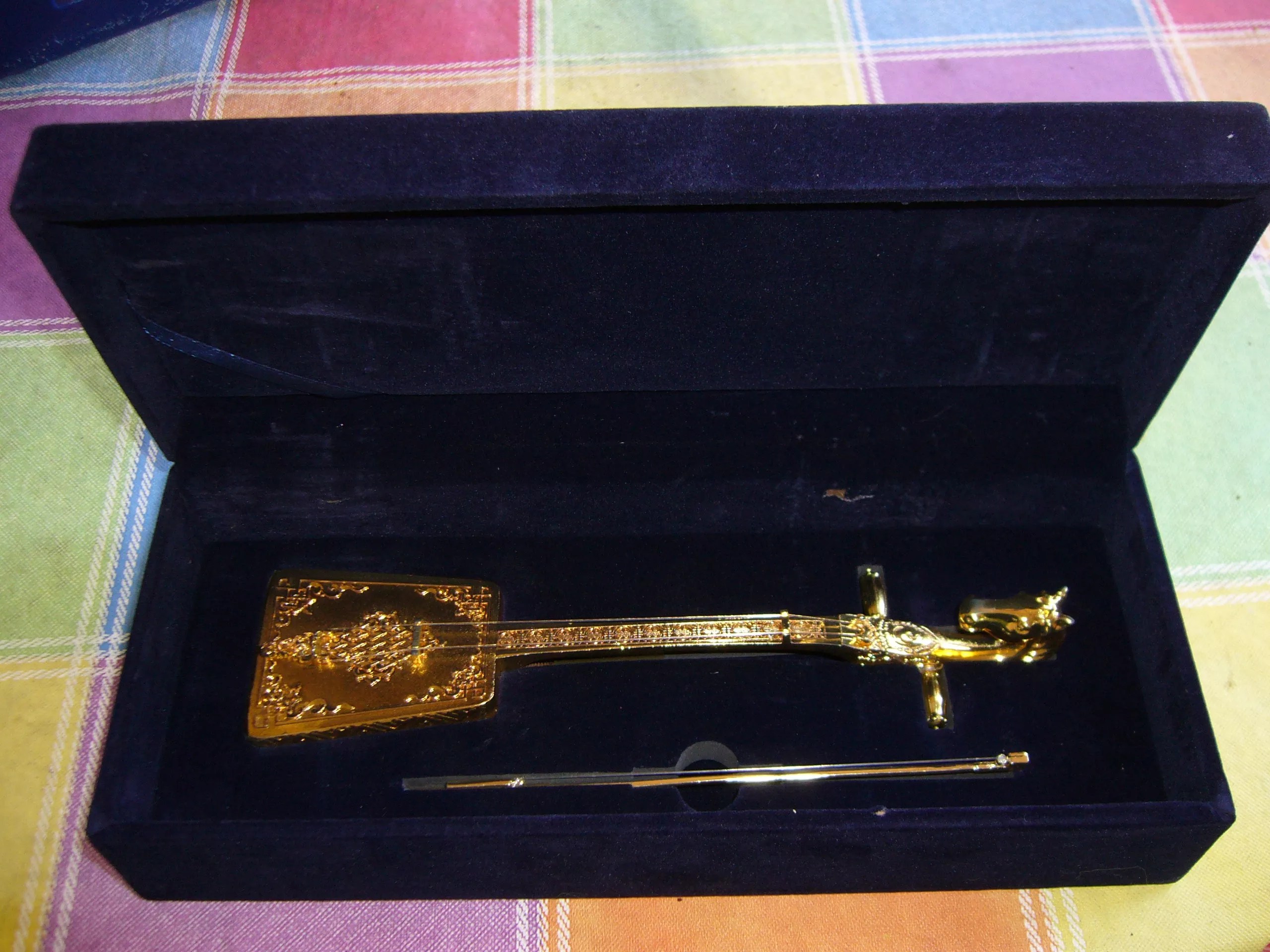 The golden Morin Khuur replica presented to Blomster following the performance of his piece.