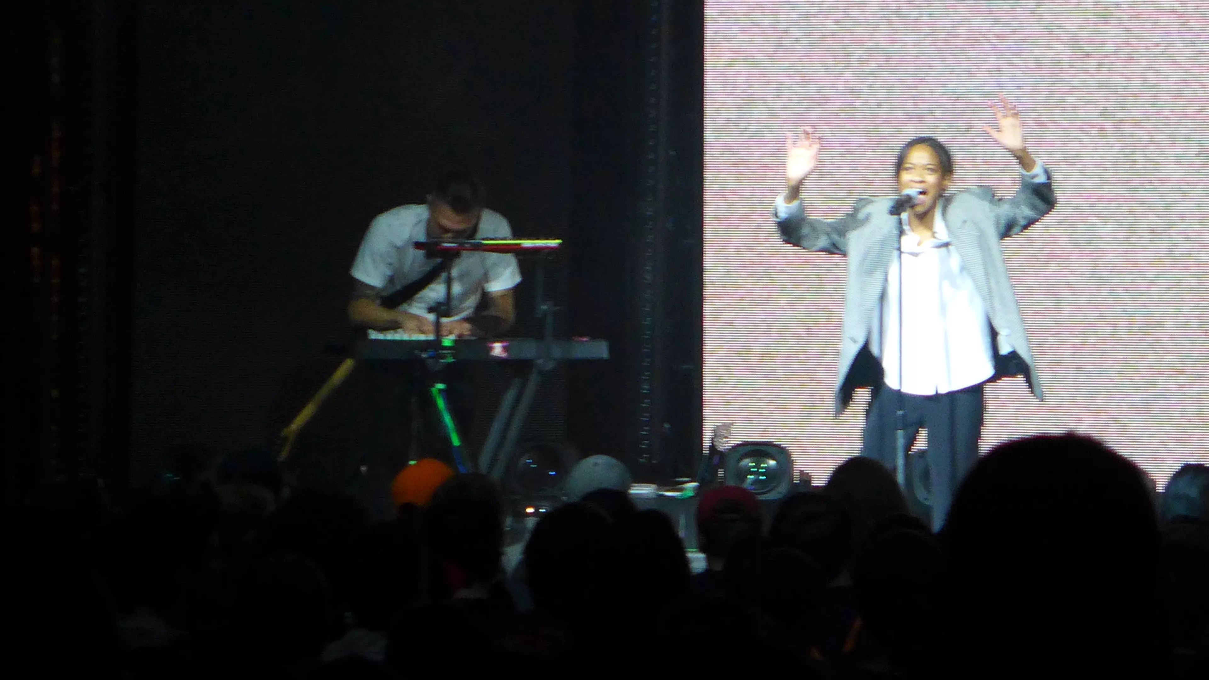 Opener Kilo Kish was worth arriving to the show on time for. Popping out at 9 p.m. on the dot, backed by a multi-instrumentalist providing beats, tracks and live guitar, she slayed for thirty juicy minutes. At first, Kish, in her signature power suit, sat at stage left at a table adorned with a red telephone. She dramatically flipped through a newspaper before walking to a microphone center stage to open with “Hello, Lakisha.” Her minor tones meshed with an electronically produced big-band sound reminiscent of BjÁ¶rk’s style.