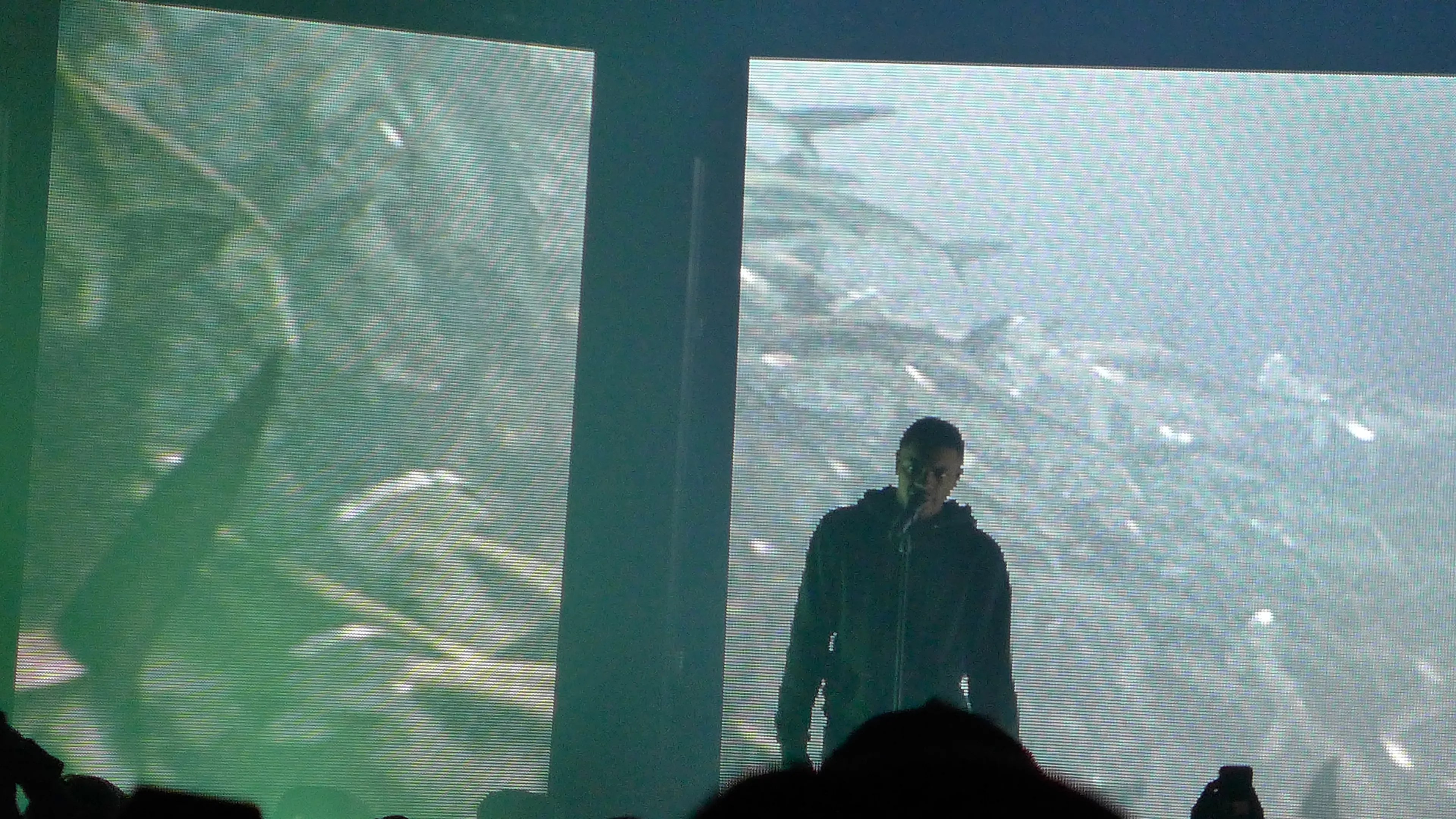 Next up, Vince Staples hurled himself onto the Gothic Theatre’s stage promptly at 10 p.m., plunging into “Prima Donna.” The tour’s “Life Aquatic” theme was spelled out on screens, now extended to three panels; projections of a bubbling aquarium and various flashes of ocean life accompanied Staples most of the evening. Draped in a hoodie, Staples delivered “Fire” without fanfare, continuing his hunched-over stance to rap through the swinging melody of the deceivingly bleak “Smile.”