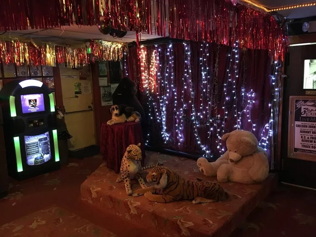 A menagerie of oversized stuffed animals combined with the lights and streamers on the Zephyr Lounge karaoke stage.