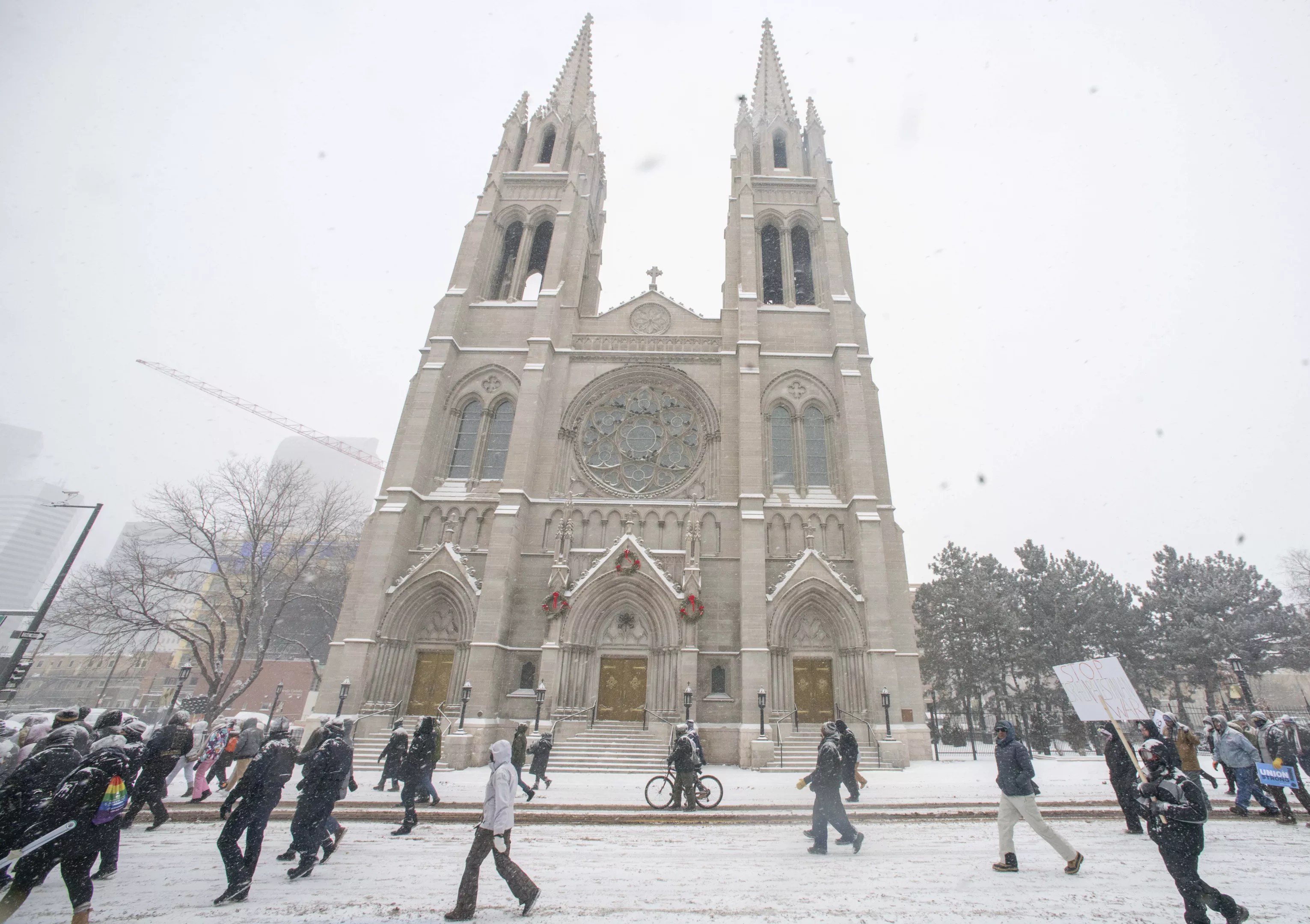 The familiar parade route passed the 110-year-old Cathedral Basilica of the Immaculate Conception .