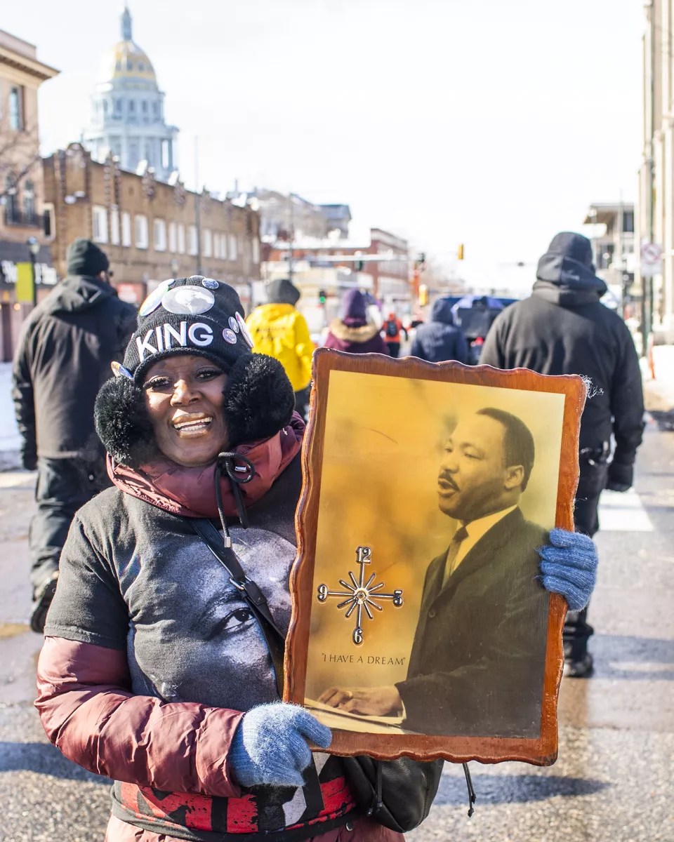 A marcher brought a portrait of MLK to the fortieth annual Marade.