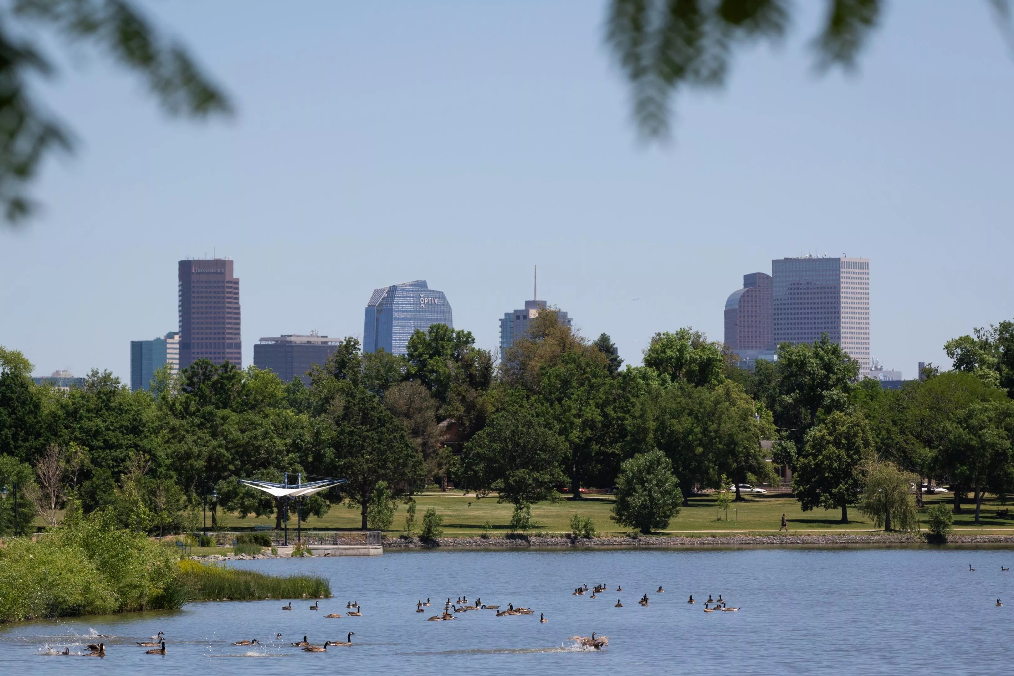 From Sloan’s Lake, Denver’s skyline peeks over the trees.