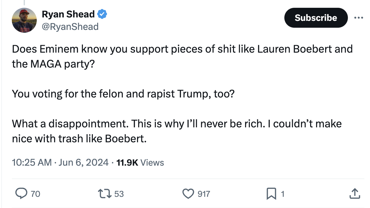 Liberal-leaning users have been calling out the Get Rich or Die Tryin’ rapper for cozying up to a staunch Republican like Boebert, with many citing his longtime friendship with former mentor and fellow lyricist Eminem, who has been a vocal critic of the GOP and previously endorsed Barack Obama and Joe Biden for president.